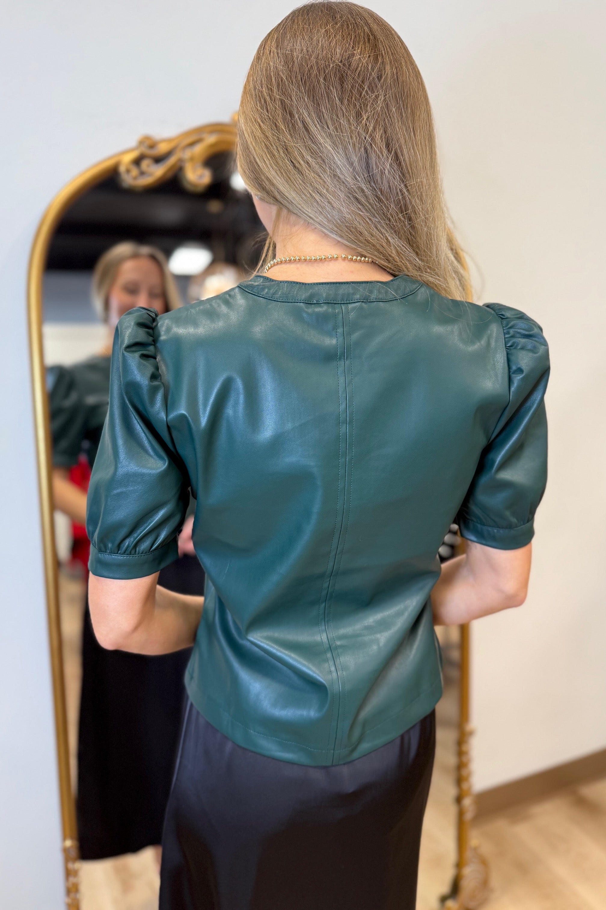 Kalia v-neck vegan leather top brings a touch of sophistication. The distinctive puff sleeves add a playful yet refined detail, in classic fit, this top a versatile choice for both casual and formal occasions. A must-have addition to your wardrobe for that edgy, chic look.