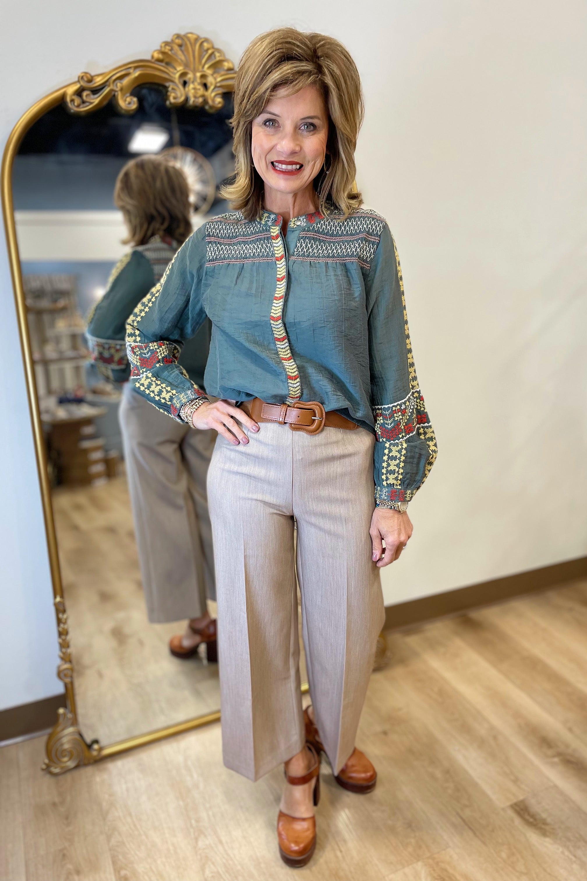 Another Love Love Sleeve Button Front Makenna Embroidered Top Slate Green