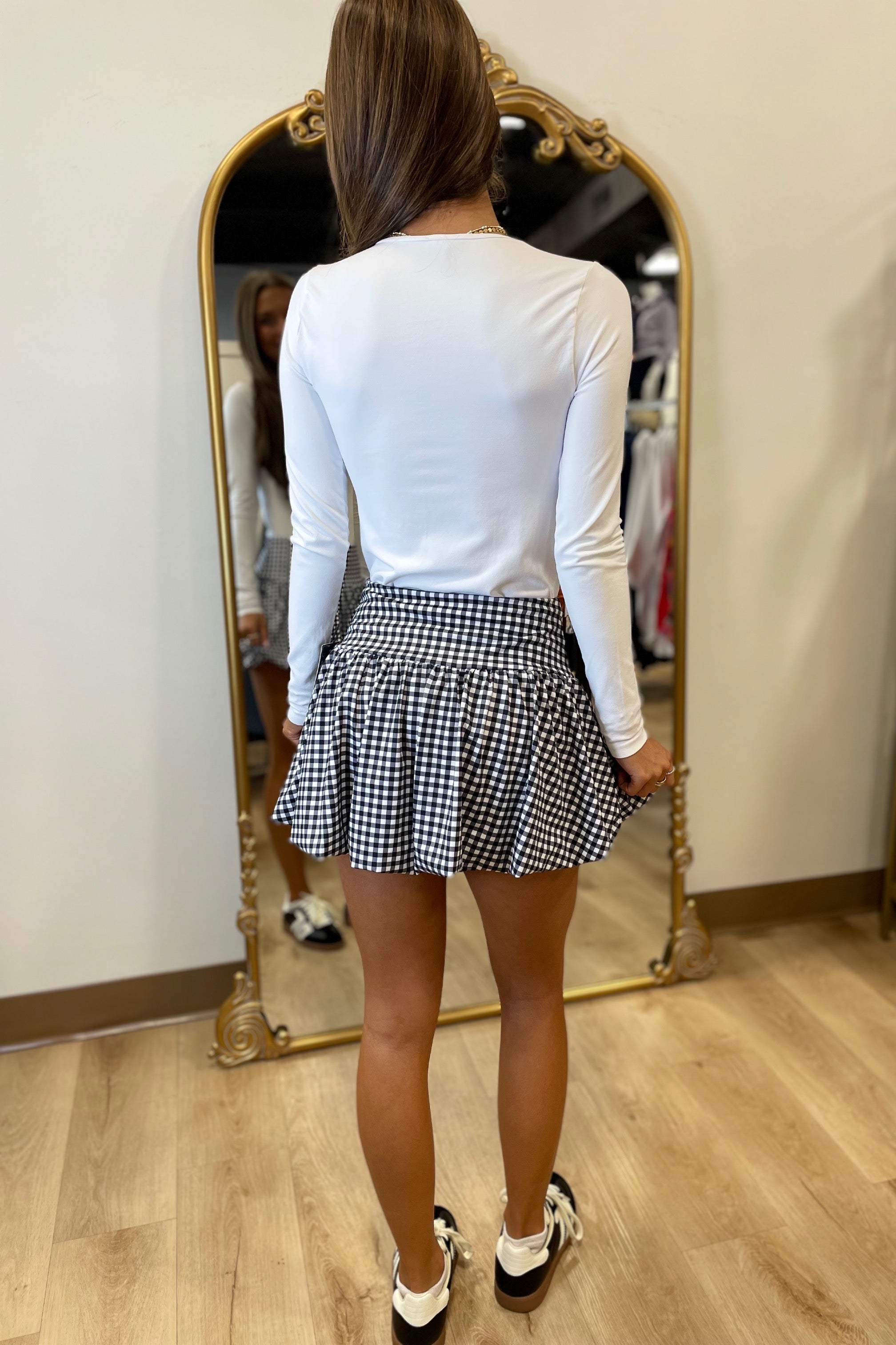 Bubble-style mini skirt in a gingham print with built-in shorts and a high waistband.