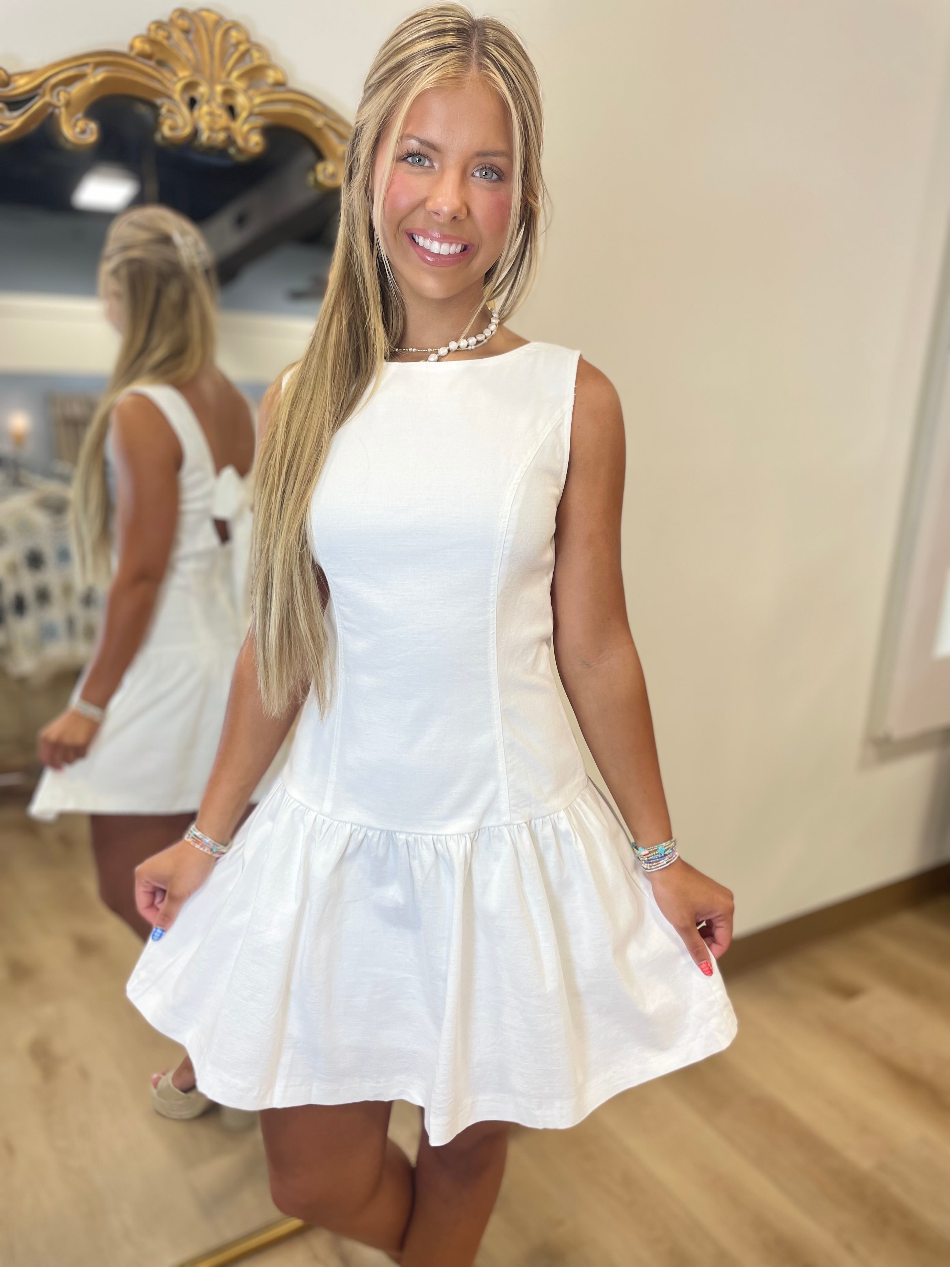 August Day Out Back Bow Tie Detail Drop Waist Boat Neck Mini Dress Lined White