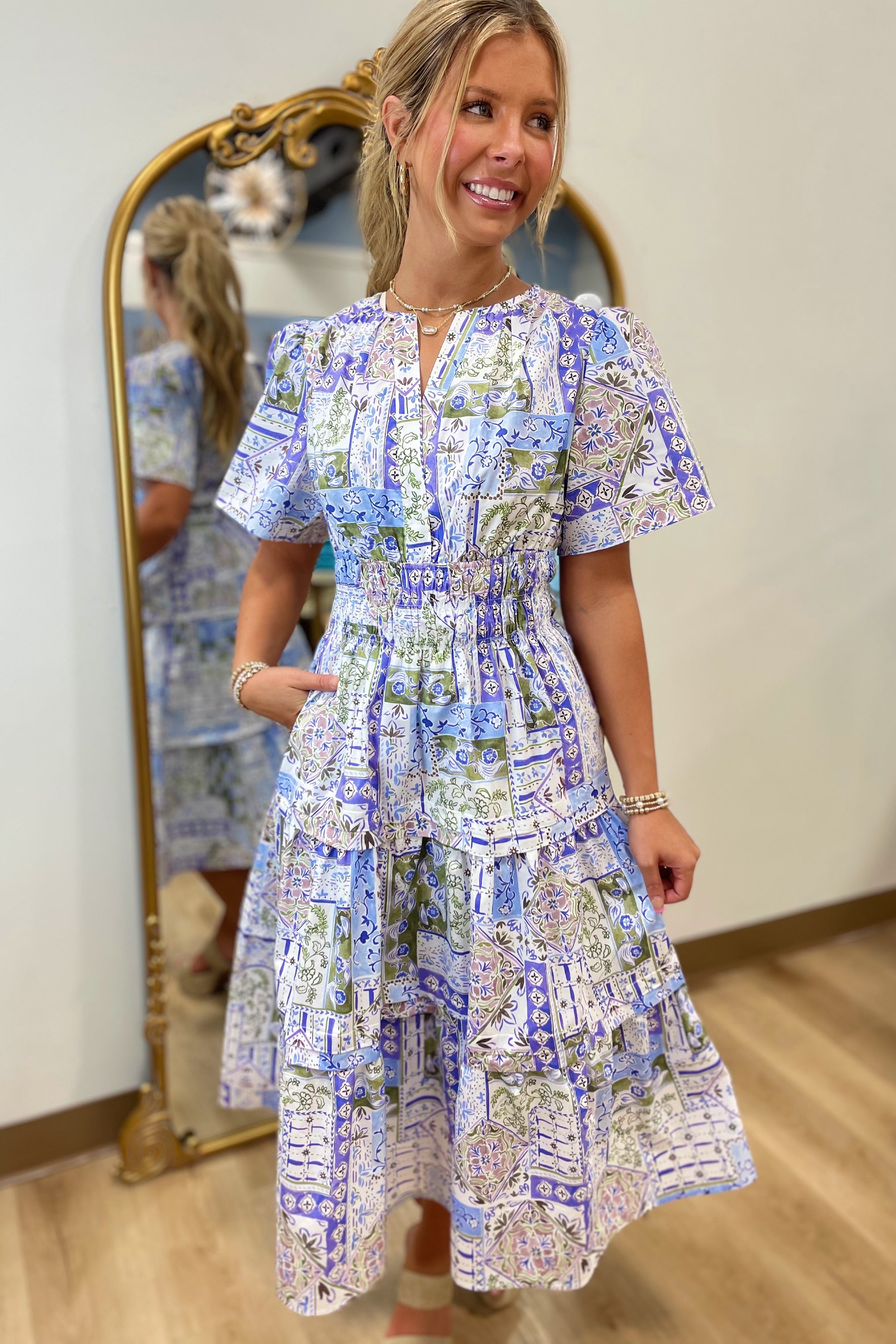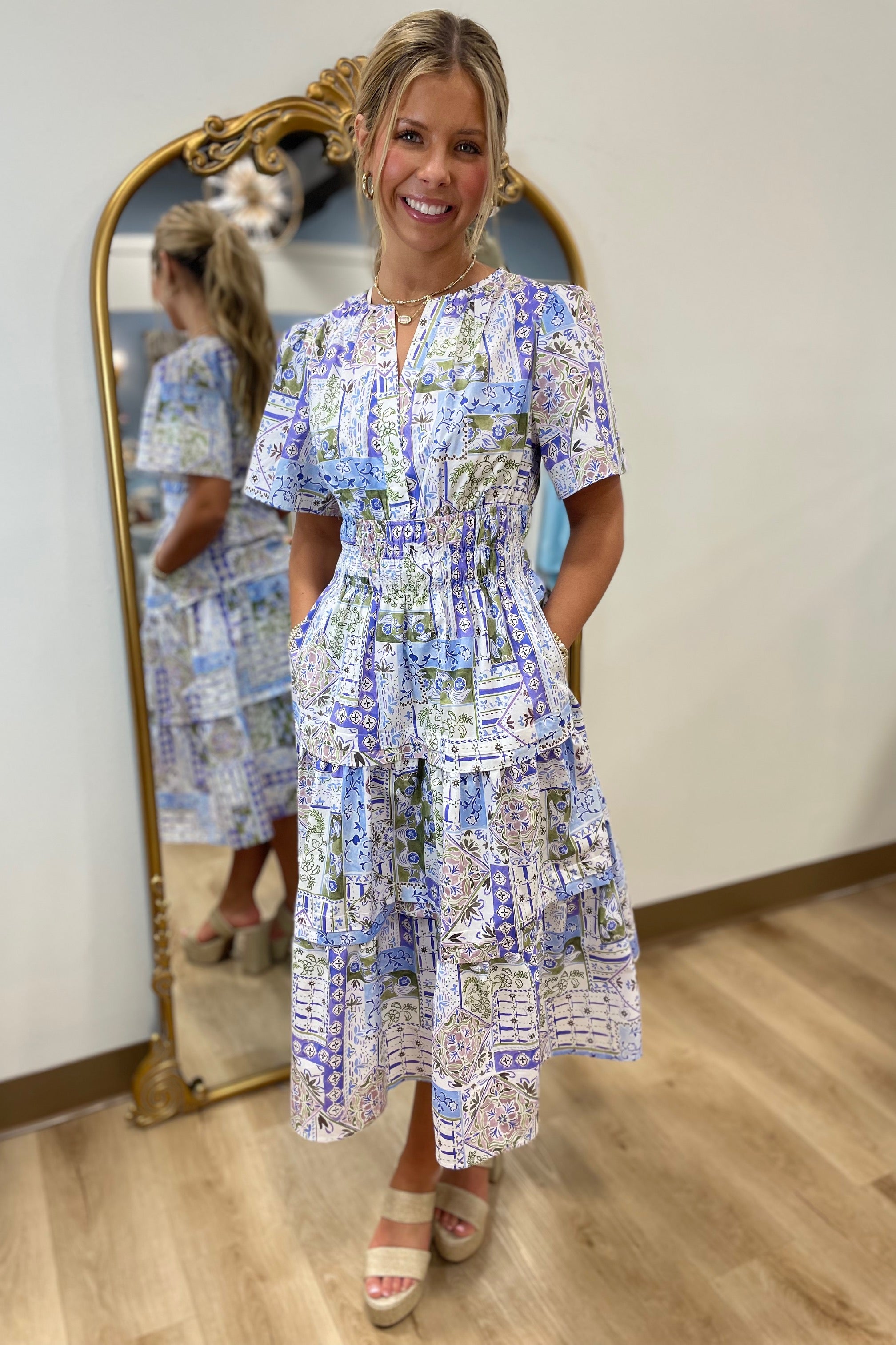 Mosaic Muse Patchwork Short Sleeve Elastic Waist Dress