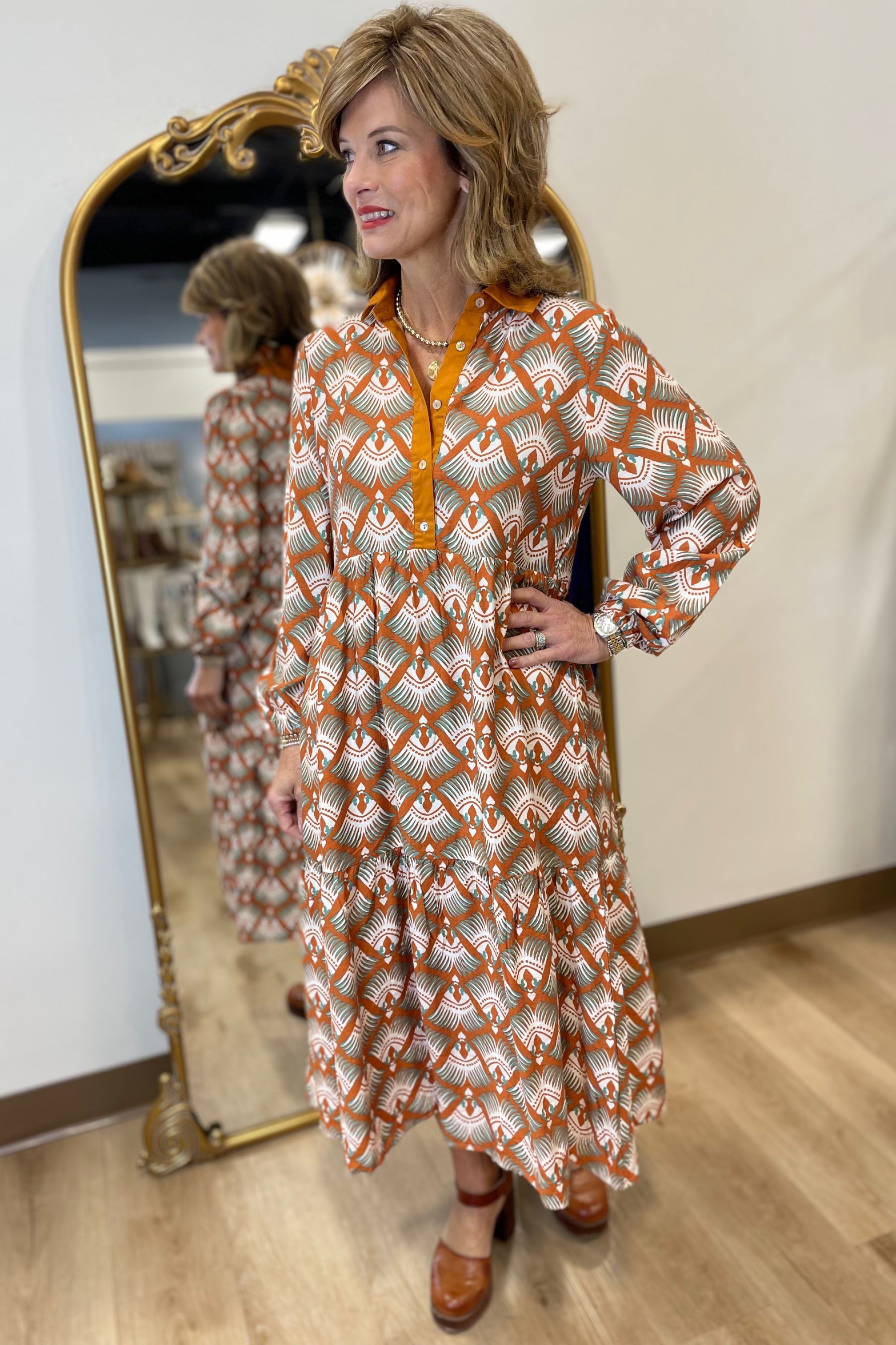 Autumn Harvest Long Sleeve Dress Rust Mix Print