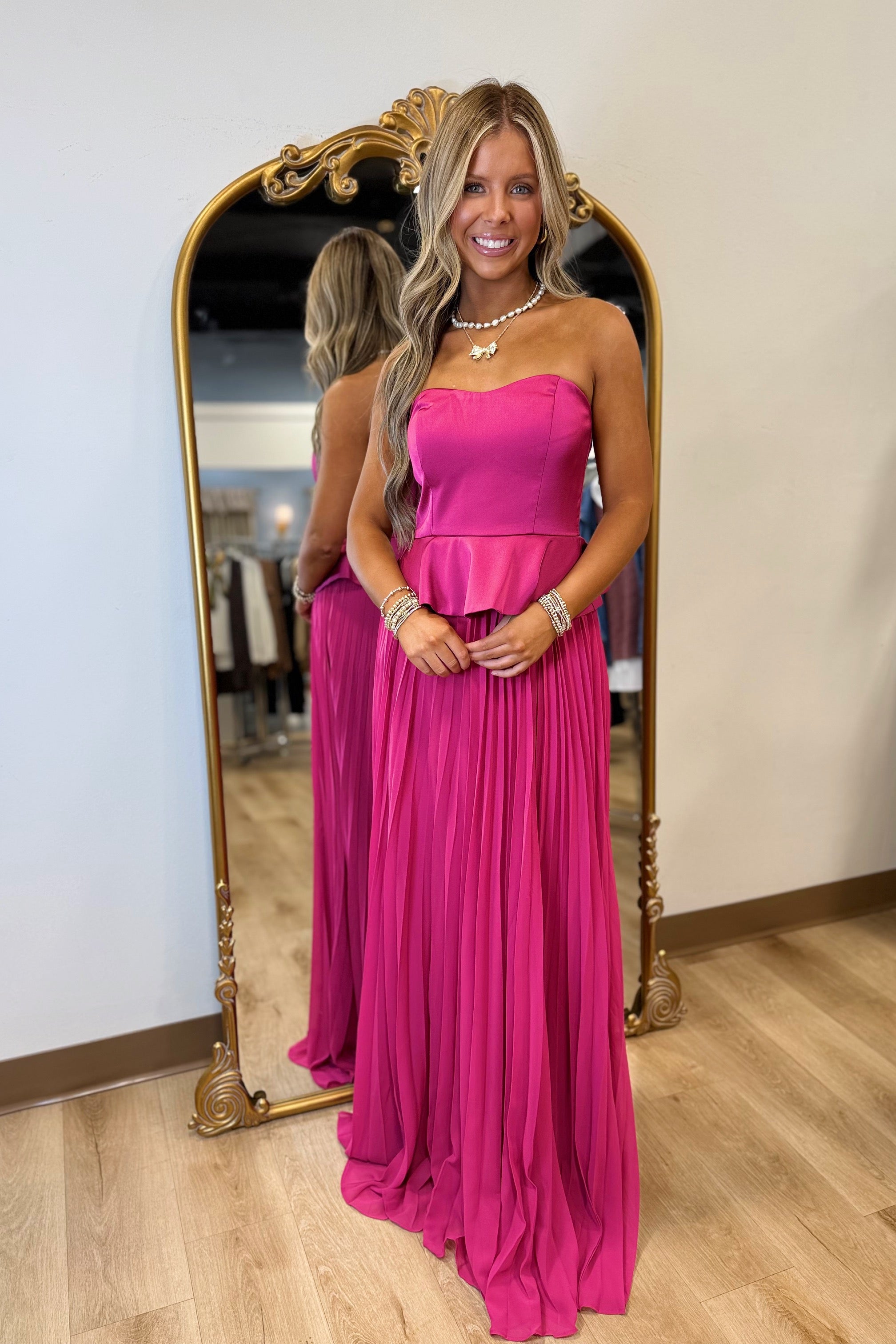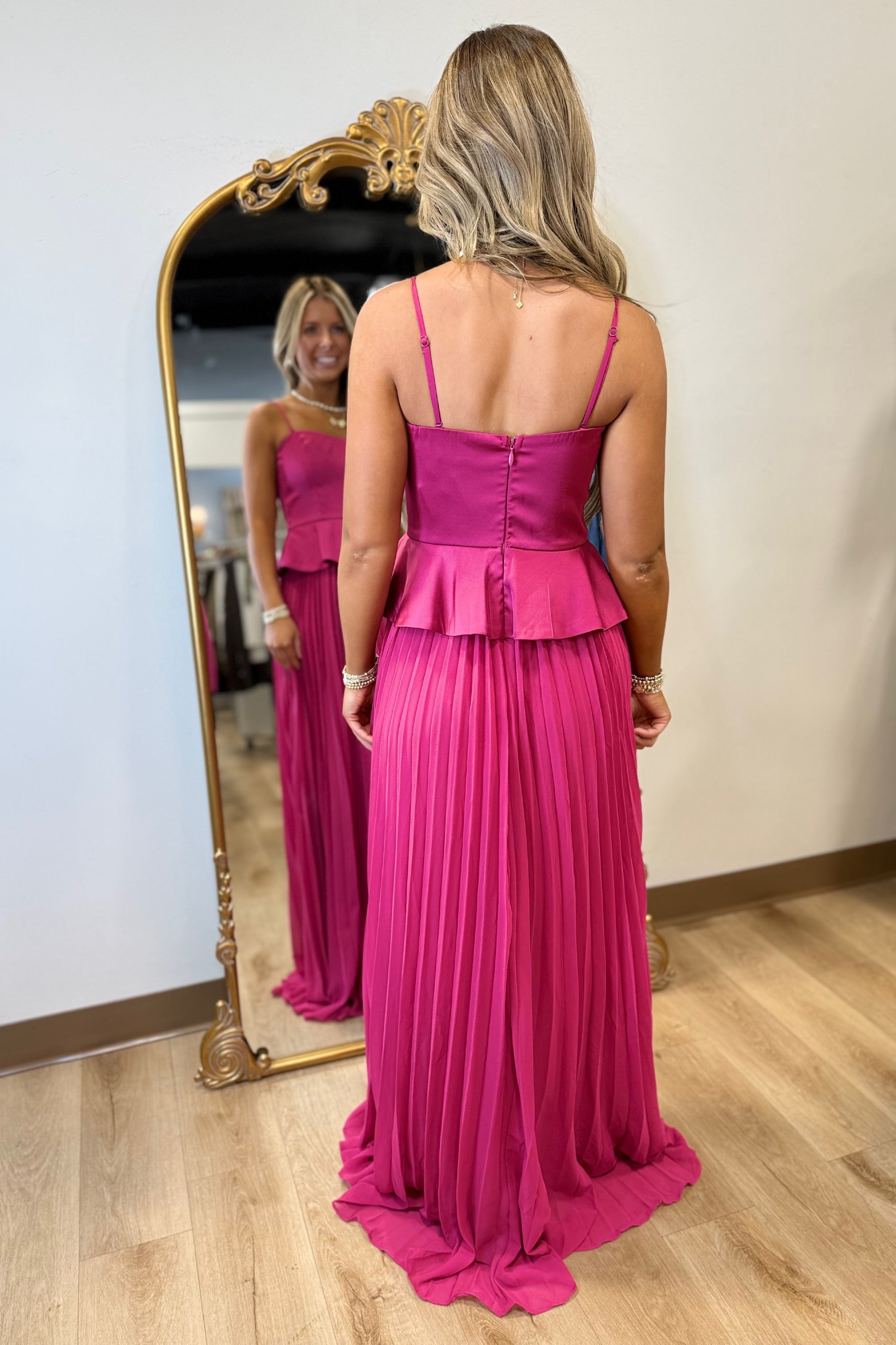 Satin Chiffon Peplum Style Maxi Dress Pink Removable Straps Pleated Body