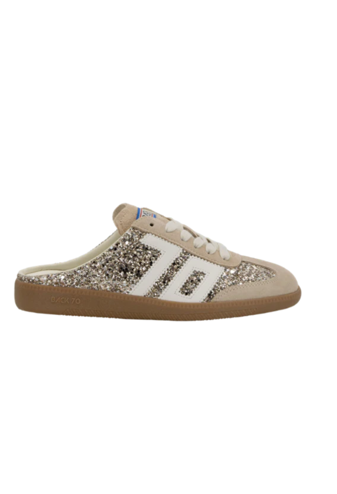 The Back 70 glitter mule brings sparkle to everyday style with a distinctly feminine, boho edge. Designed in shimmering gold glitter, this effortless sneaker mule blends laid-back charm with the brand¿s signature vintage detailing. The open-back silhouette adds ease and personality, while subtle suede trims and retro accents keep it unmistakably Back 70. A perfect mix of glamour and casual cool, it¿s made for the girlie girl who loves her sneakers with a little shine.