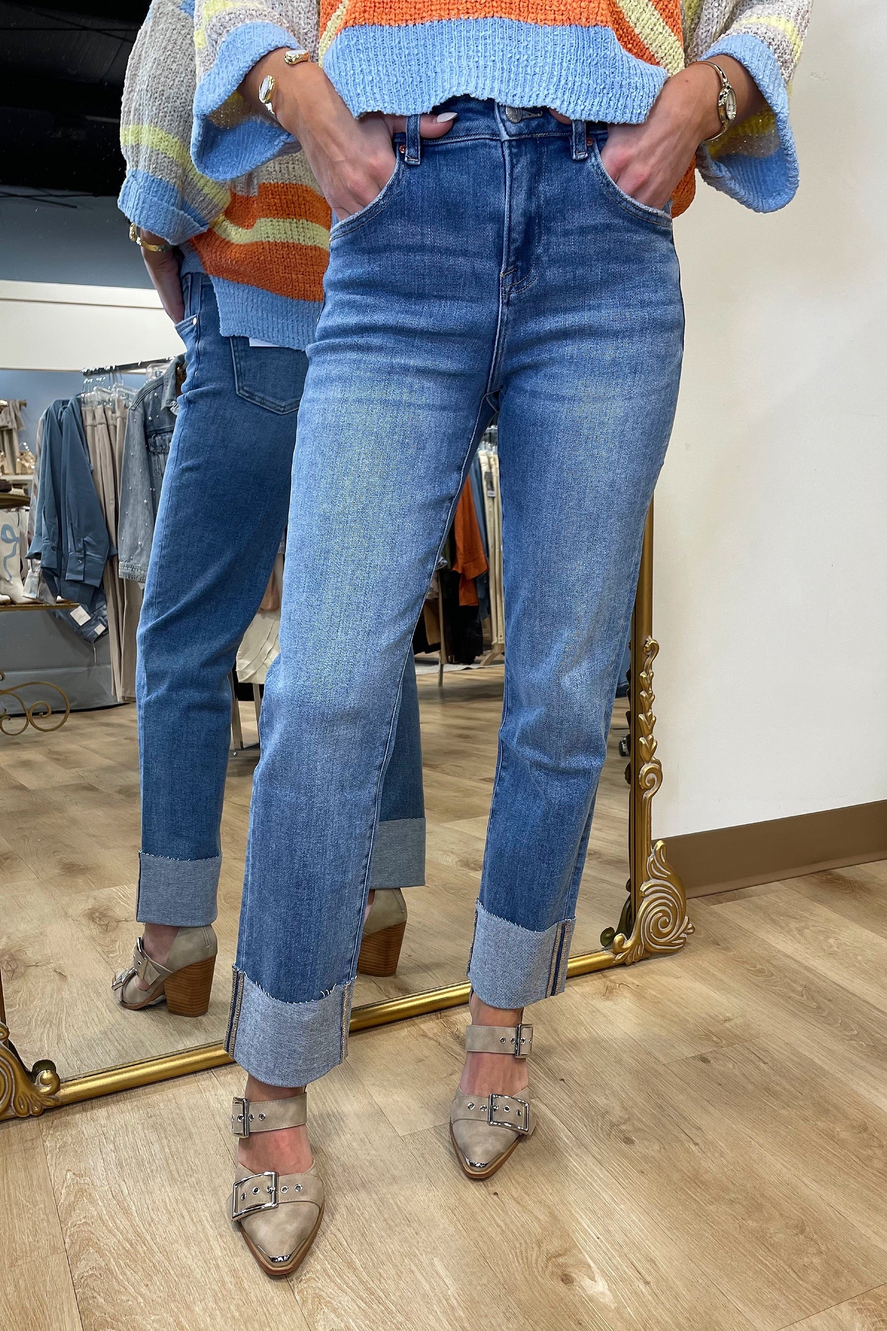 Bayeas High Rise Straight Leg Jean w Rolled Hem.