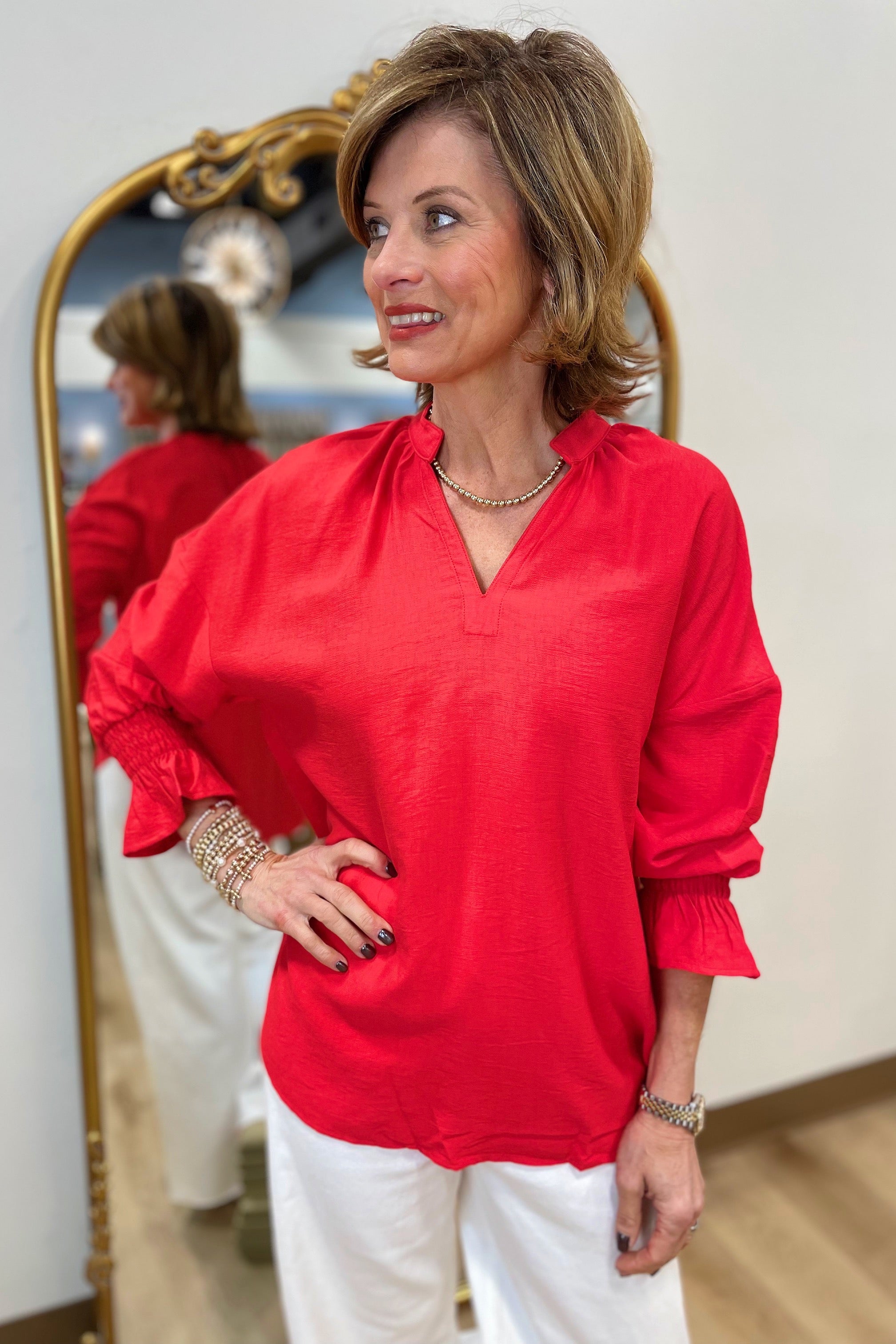 Blaire Split Neck Blouse w 3/4 Sleeve w Elastic Cuff Red