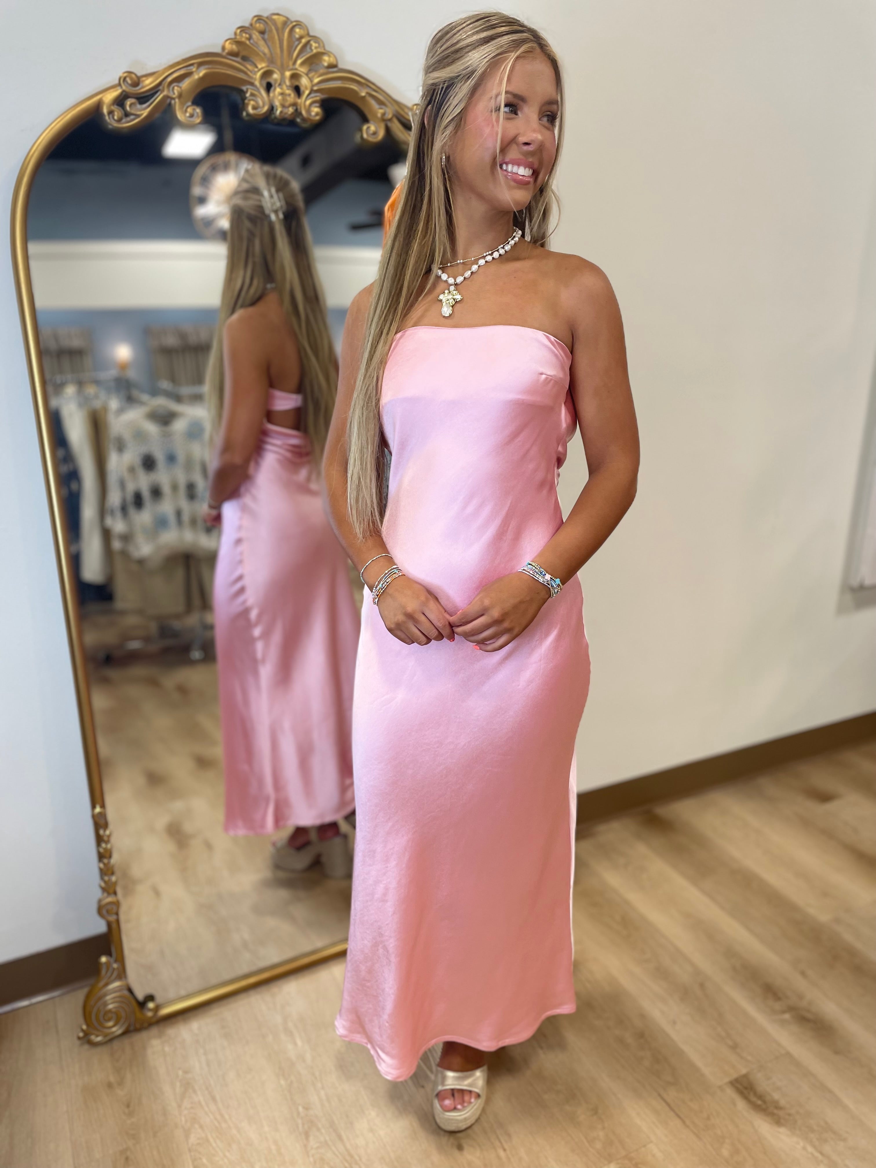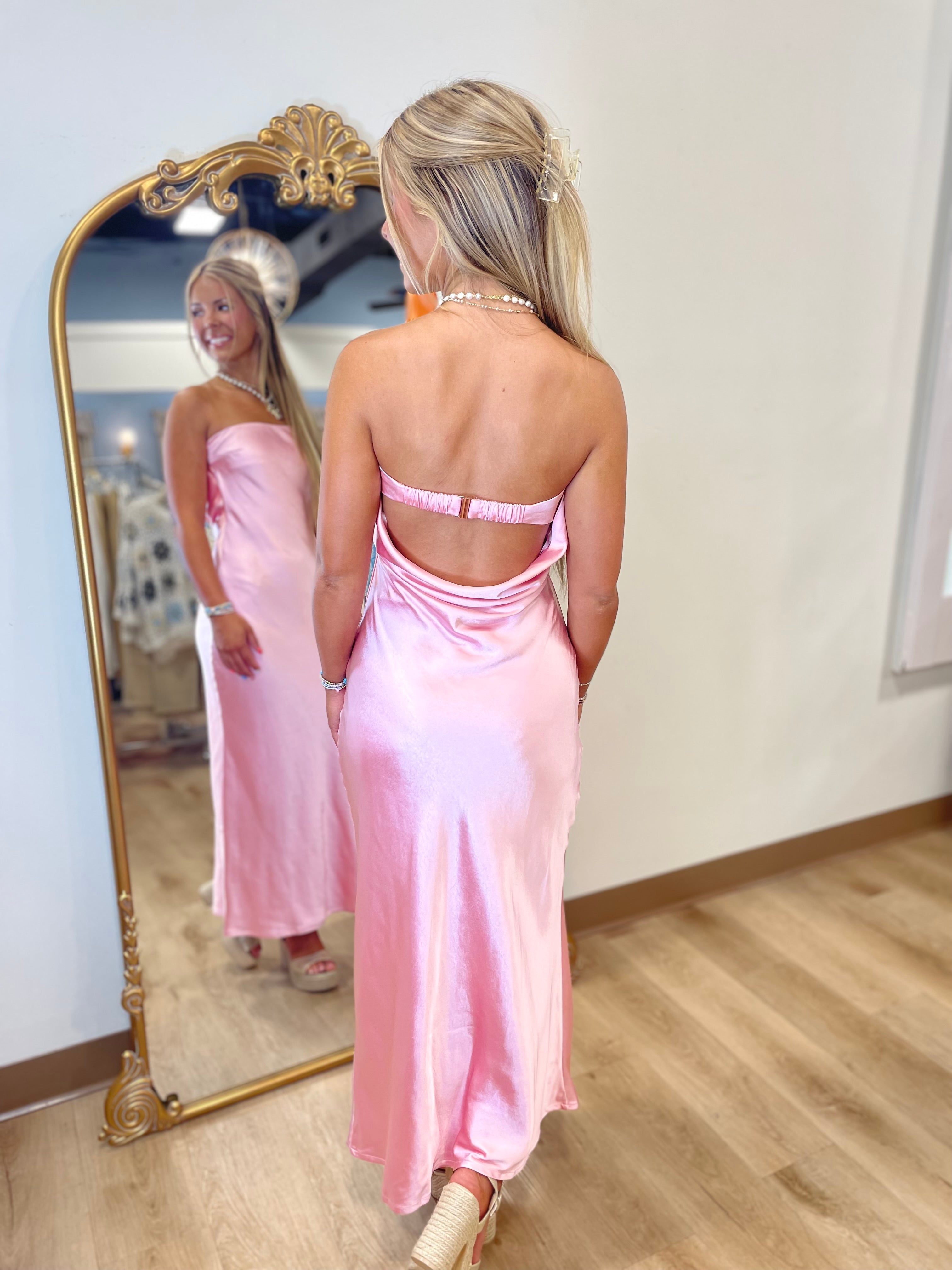 CHIC STRAPLESS BIAS OPEN-BACK MAXI SLIP DRESS TUBE STYLE FORM FITTING SATIN MATERIAL OPEN COWL BACK BRA STRAP CLOSURE MAXI LENGTH