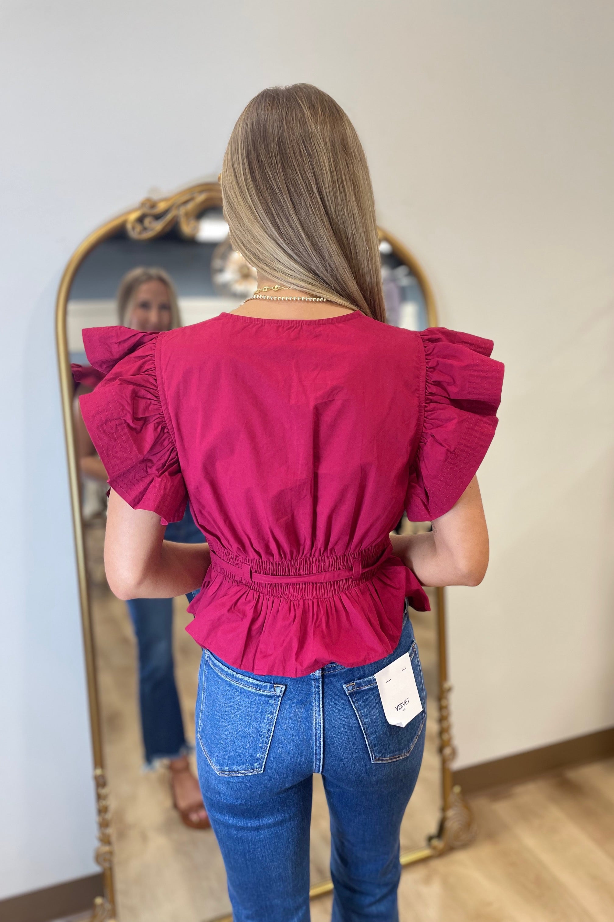 Bordeaux Breeze Flutter Sleeve Peplum Poplin Top w Belt