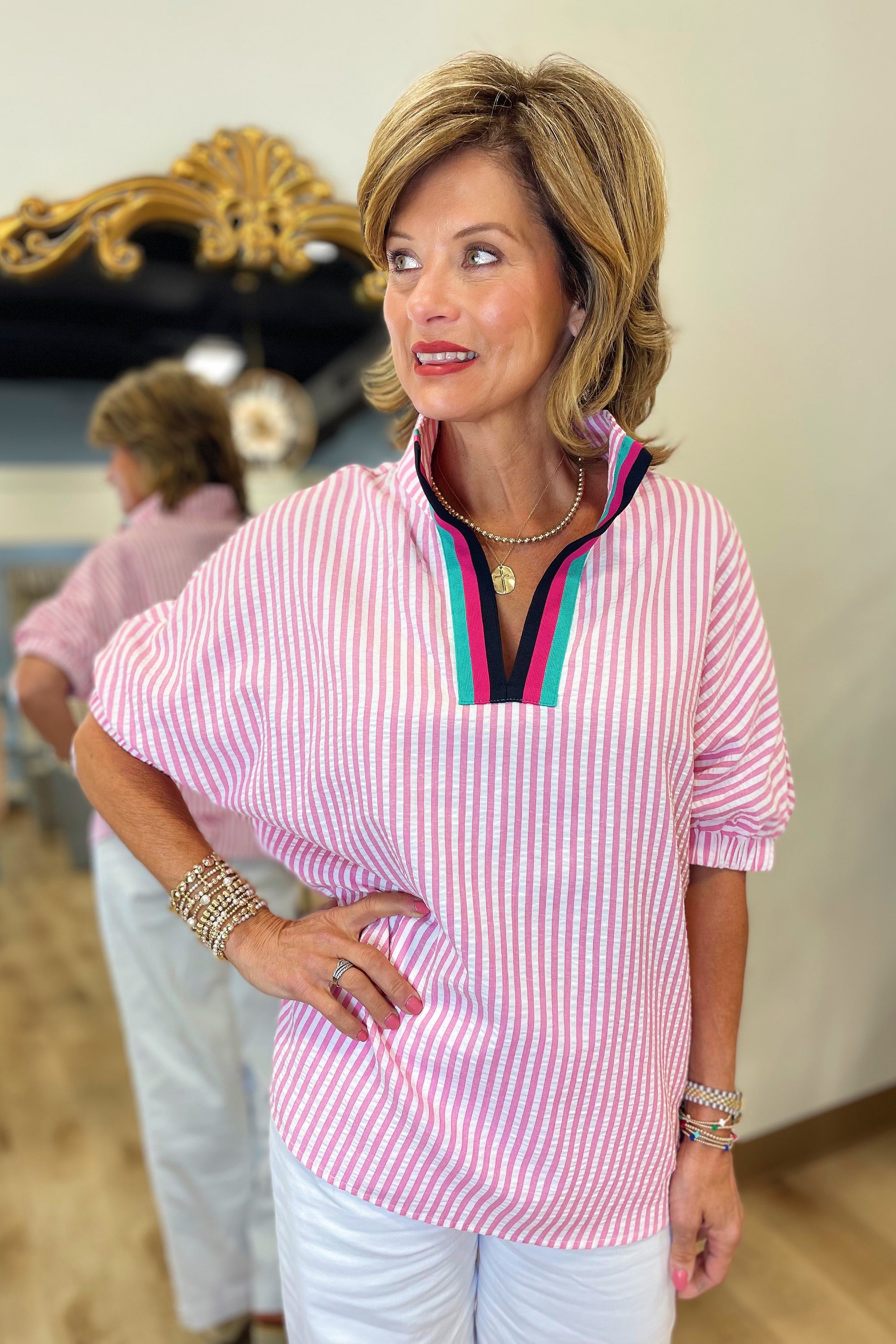 Brillant Stripe Short Sleeve Blouse w Contrast Trim Pink.