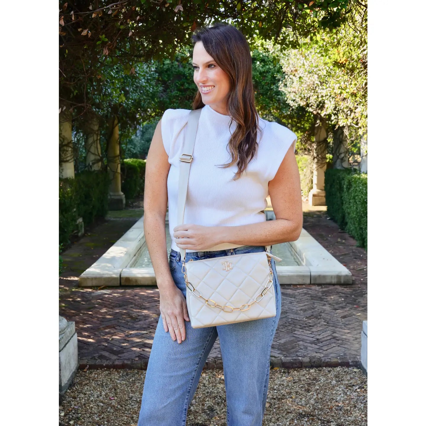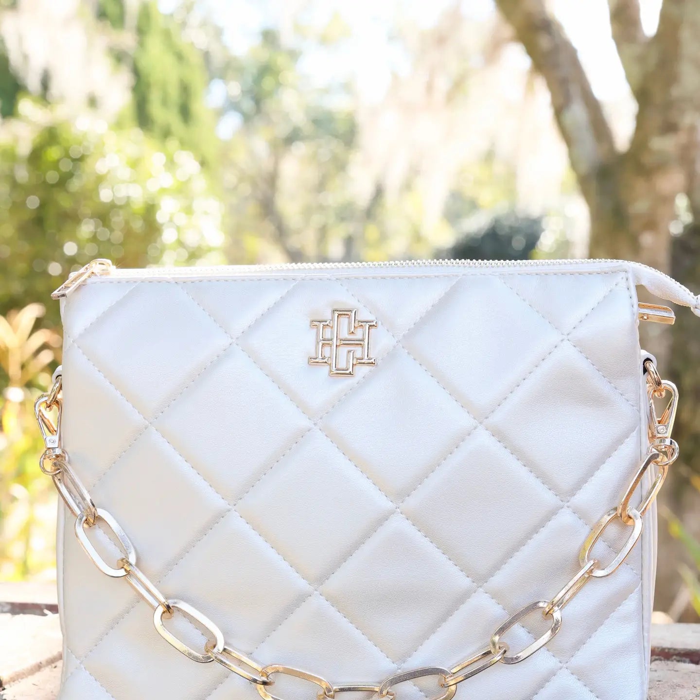 This quilted vegan leather crossbody is so fashion forward! It features a gorgeous leopard print that is oh so soft. It has a chunky gold chain accent that is removable, and it can be used as a carrying strap as well. The crossbody strap is made of nylon and is also adjustable and removable. The top zipper closure leads to two open compartments as well as a third middle zippered section. It also has two smaller internal open pockets and one zippered pocket.