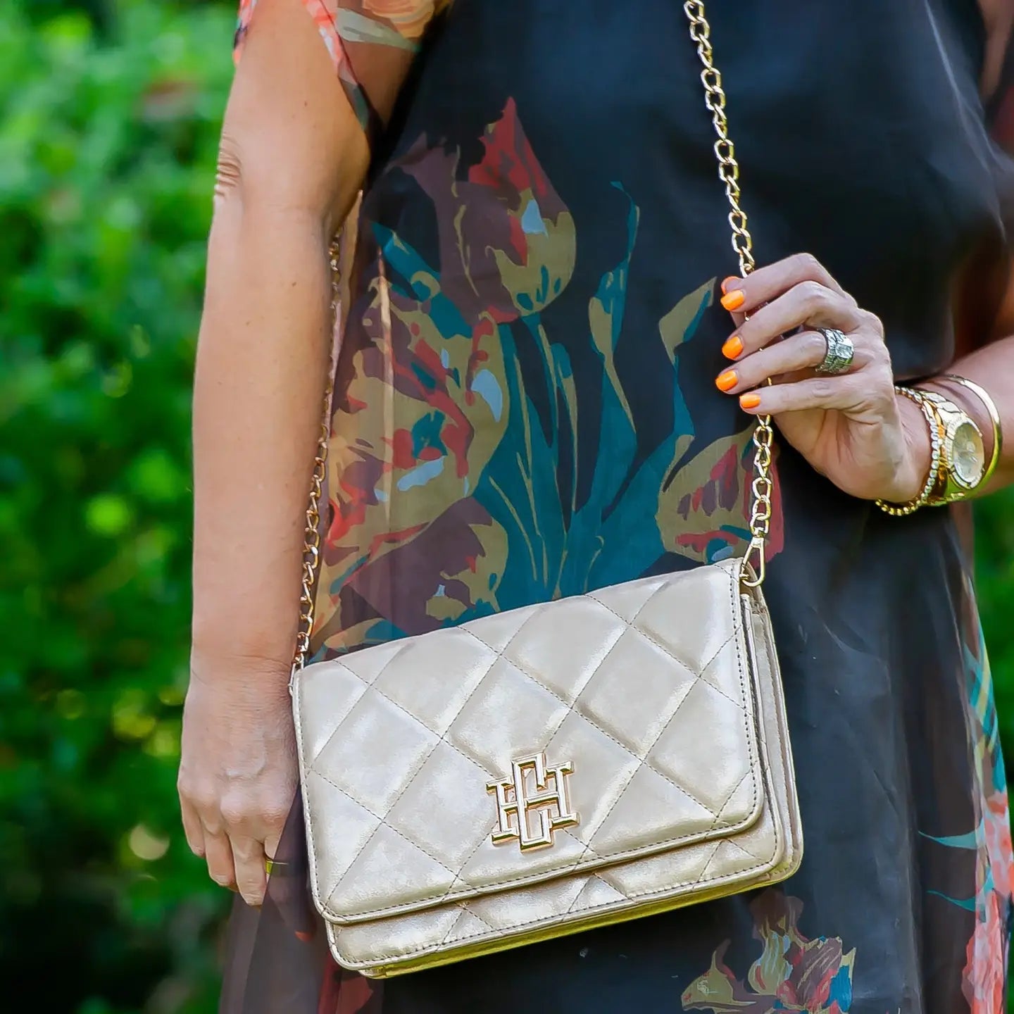 This metallic textured, vegan leather crossbody is equipped to keep you organized! There are built in credit card slots inside as well as a zippered pocket and open pocket. It features the signature, shiny gold Caroline Hill logo on the front magnetic flap. The chain crossbody strap has a strip of matching material to sit comfortably on your shoulder. It can also be removed to carry as a stylish clutch. Great for events or everyday wear!