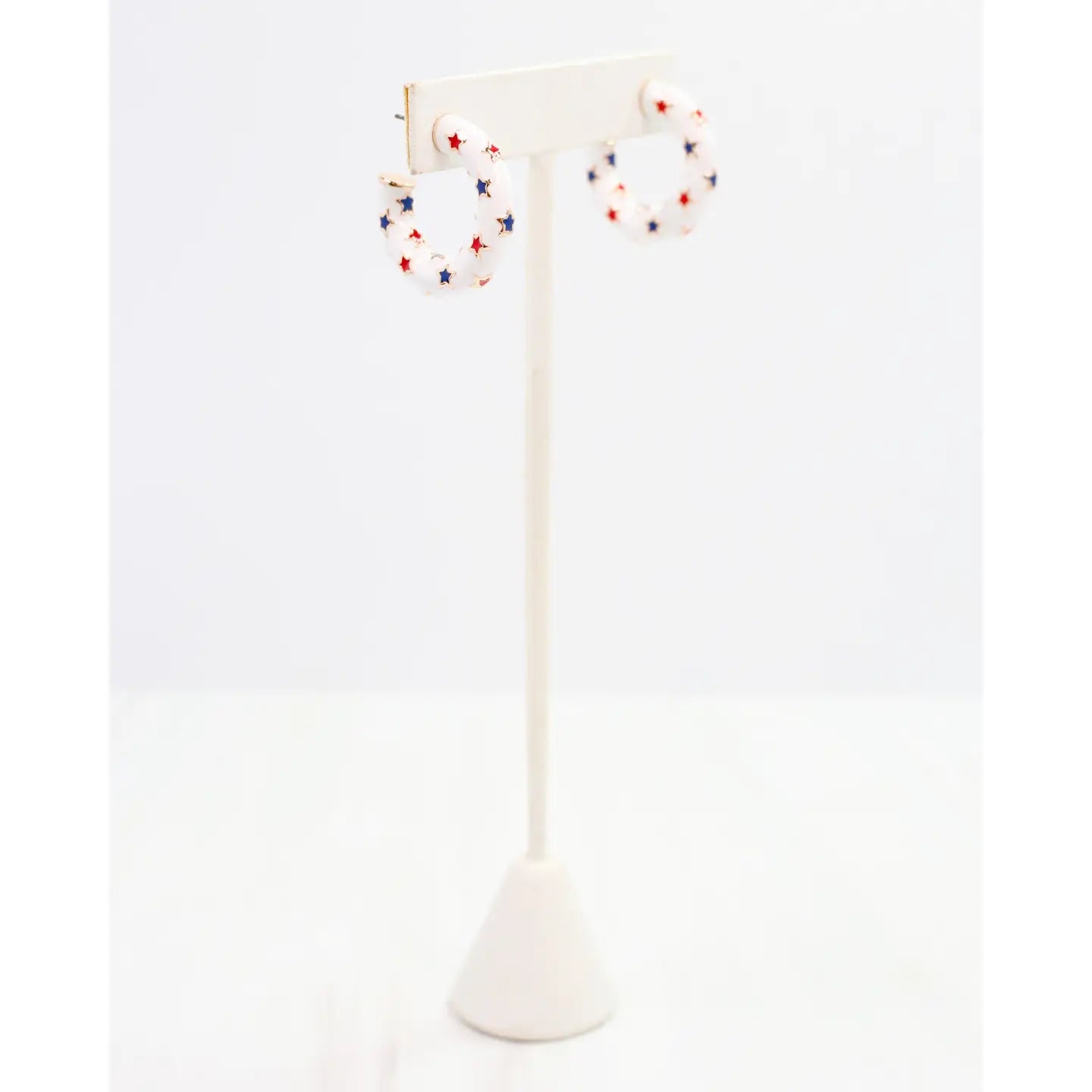 Add some playful stars to your wardrobe with our Burr Star Hoop Earrings! These prideful and preppy earrings are perfect for any patriotic occasion, and feature gold trimming for a touch of elegance. Perfect for July 4th or any day you want to show off your American spirit. Dimensions: * 1" Diameter * Titanium Post.