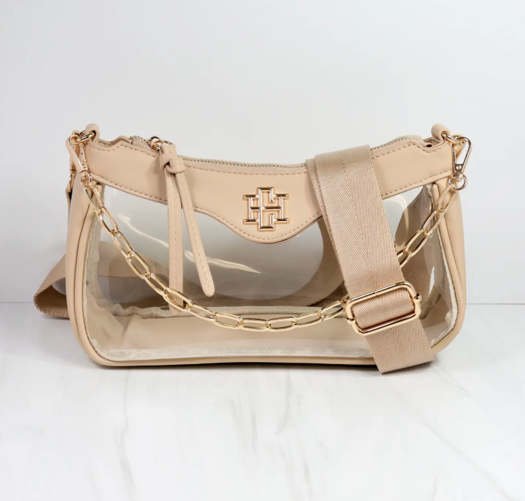 The Cassidy Clear Crossbody in Nude combines style and comfort effortlessly. Featuring a removable chain and a soft nylon strap, it adapts to your look and mood. Perfectly pairs with our gameday purse chains and the Molly cardholder for a coordinated, fashionable ensemble. Dimensions: 10.5" x 3" x 5.5".