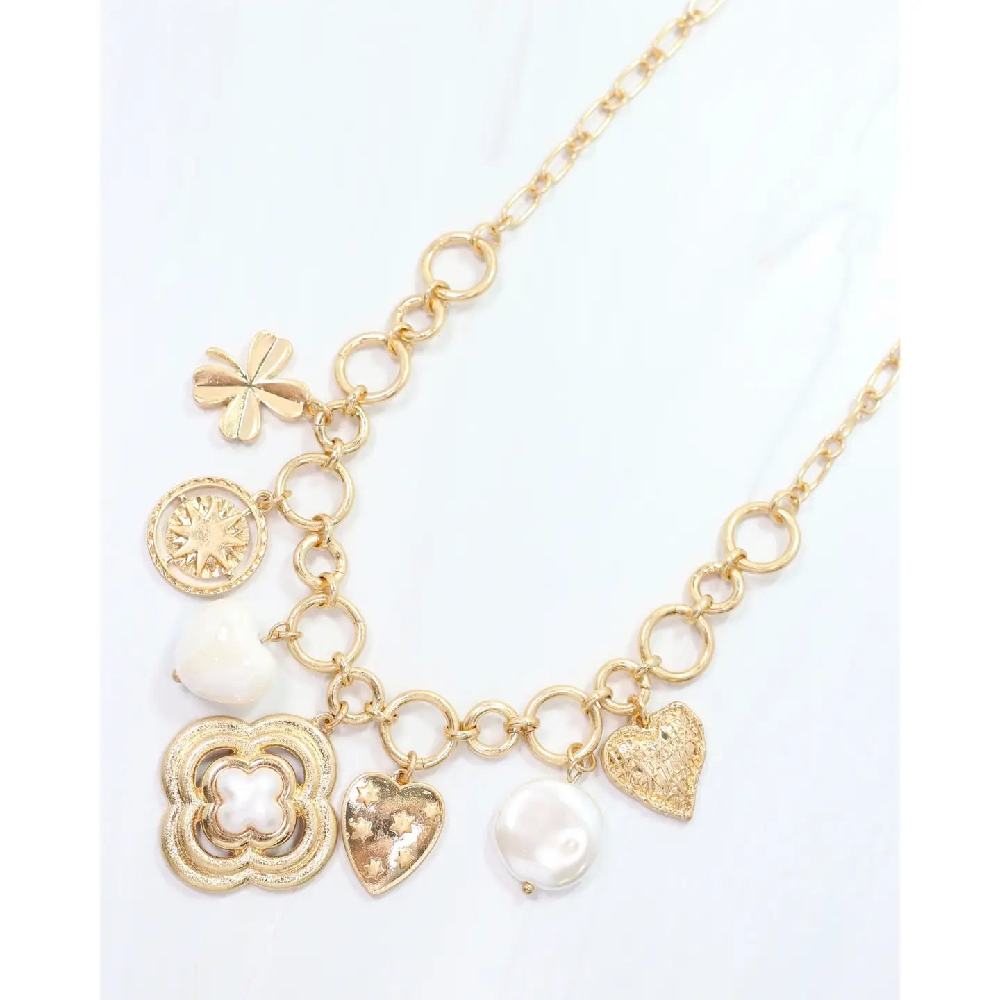 Add a touch of whimsy to your classic style with the Duchess Charm Necklace in worn gold. This playful piece features seven charming symbols - a clover for luck, a compass for direction, hearts for love, and pearls for elegance. A little fun never hurt anyone! Dimensions: * 17" Length * 3" Extender * Middle Drop Pendant 1.5" length