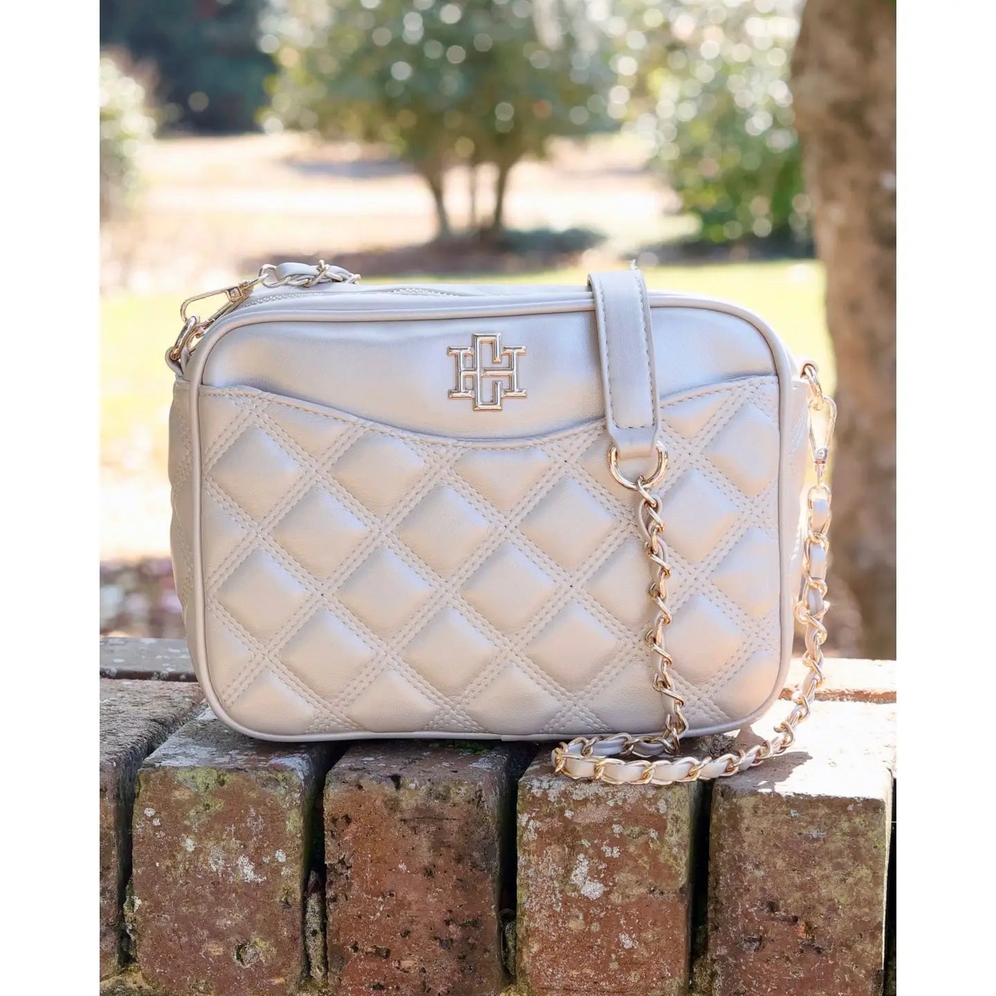 This compact handbag is perfect for both travel and everyday use, featuring a quilted vegan leather fabric and a stylish braided chain crossbody strap. The exterior includes a large open front pocket for easy access to essentials like your phone. The interior is designed with one zippered pocket and an additional open pocket for organized storage. Its chic yet practical design makes it a versatile accessory for any occasion. The Pearl Quilted DQ color describes the shape of the quilting (Diamond Quilted) on this soft material. Dimensions: 6.75" tall by 9.25" wide 2.75" wide.