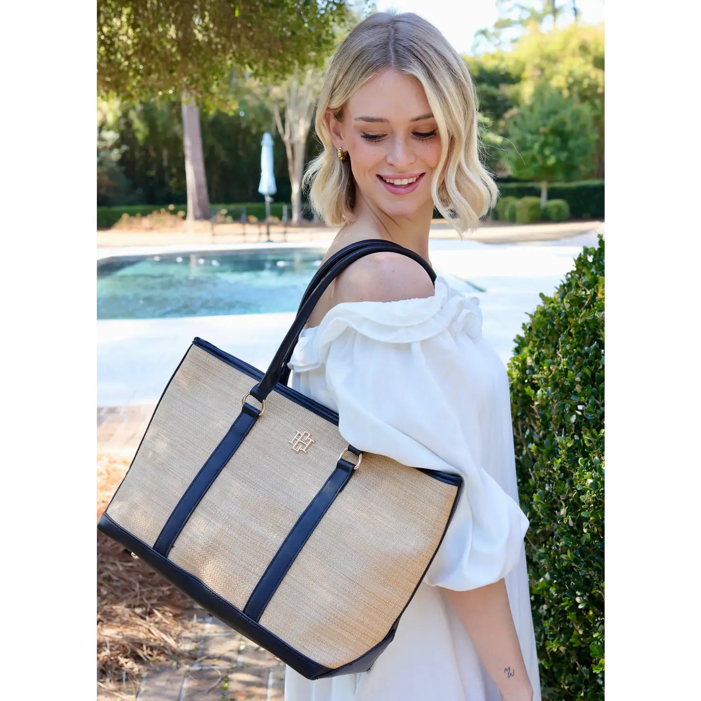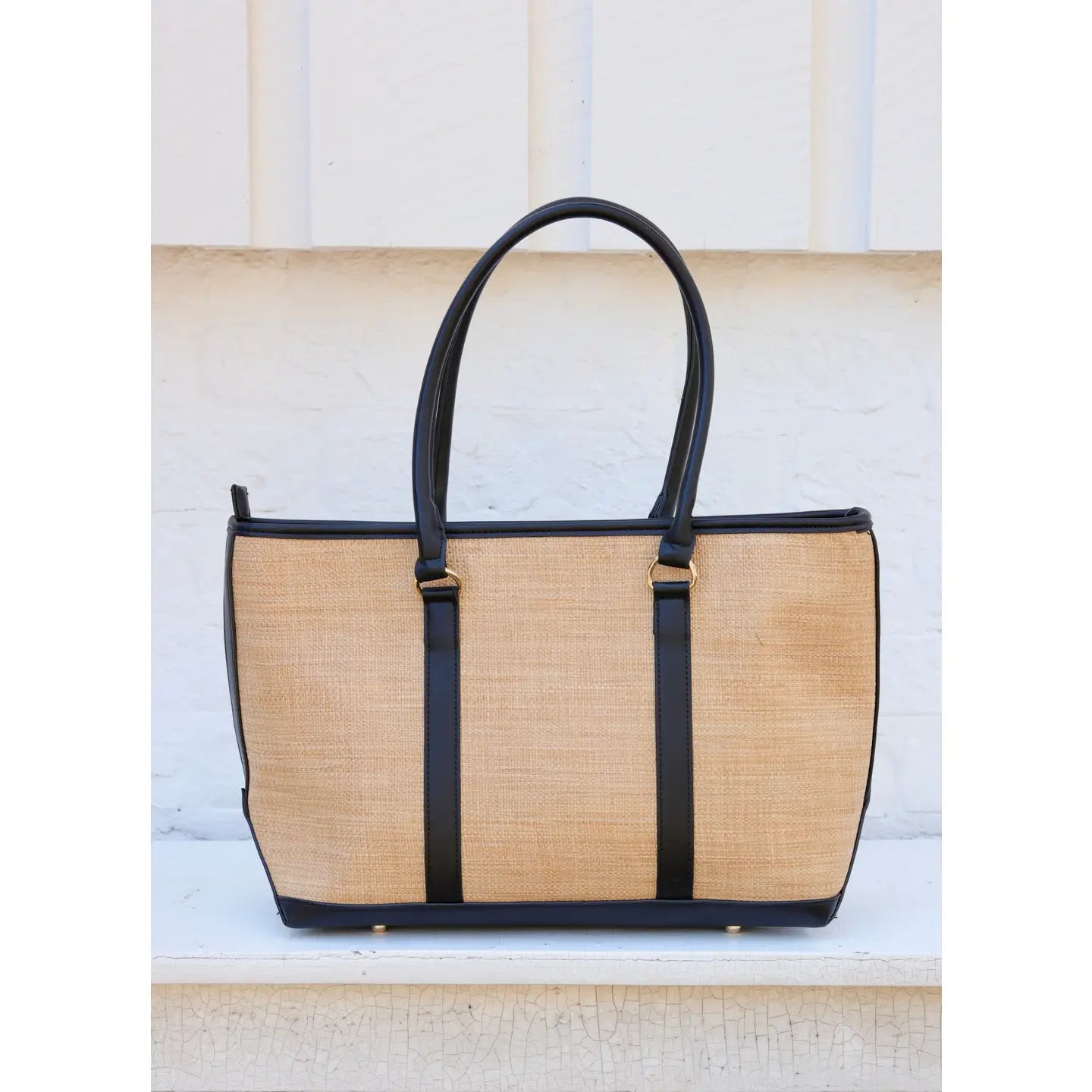 This stylish handbag is made with a straw fabric and vegan leather accents. It has two elongated handles and an accent front pocket perfect for holding a phone or other personal items. The top zipper closure ensures that your items stay secure, and the spacious interior is designed to hold all of your essentials. It also has an interior zippered pocket as well as two open pockets for added organizational ability. Dimensions: 11.5" tall by 18" wide 5.5" base 9" handle drop.