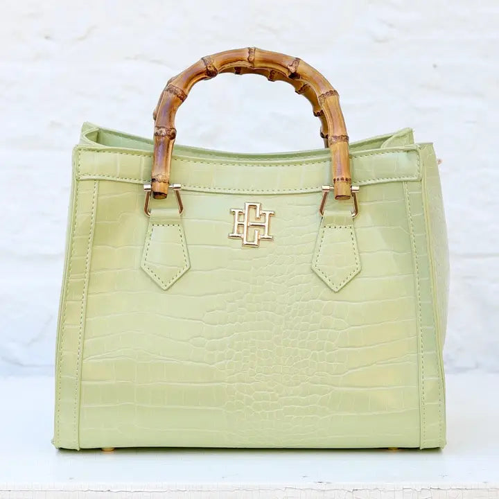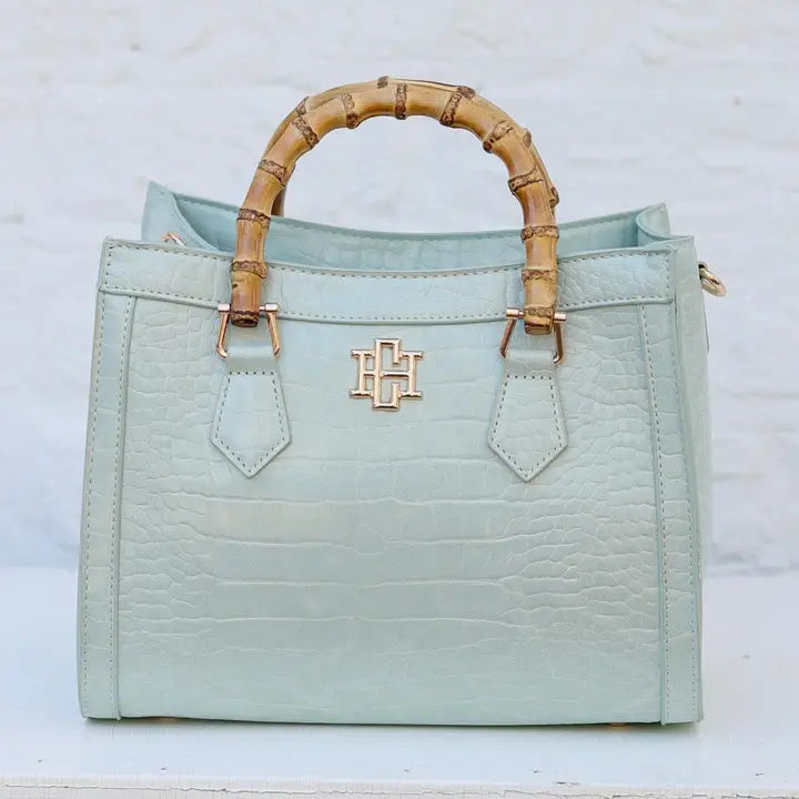 The Kennedy Tote in Blush Vegan Croc is this season's must-have style. Crafted with elegant bamboo handles and a removable crossbody strap, this mini tote transitions effortlessly from day to evening. Whether you're carrying essentials to the office or out for the weekend, its chic silhouette and versatile design make it the perfect companion for any occasion.