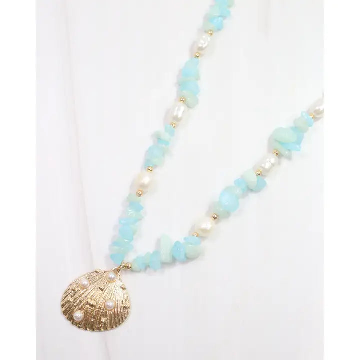 Add a splash of ocean vibes to your look with this Aqua Stone and Pearl necklace. Featuring a gold shell pendant with delicate pearl accents, it’s perfect for channeling breezy, beachy elegance. Lightweight, unique, and effortlessly chic—your new go-to accessory! Dimensions: * 15.5" Length * 3" Extender