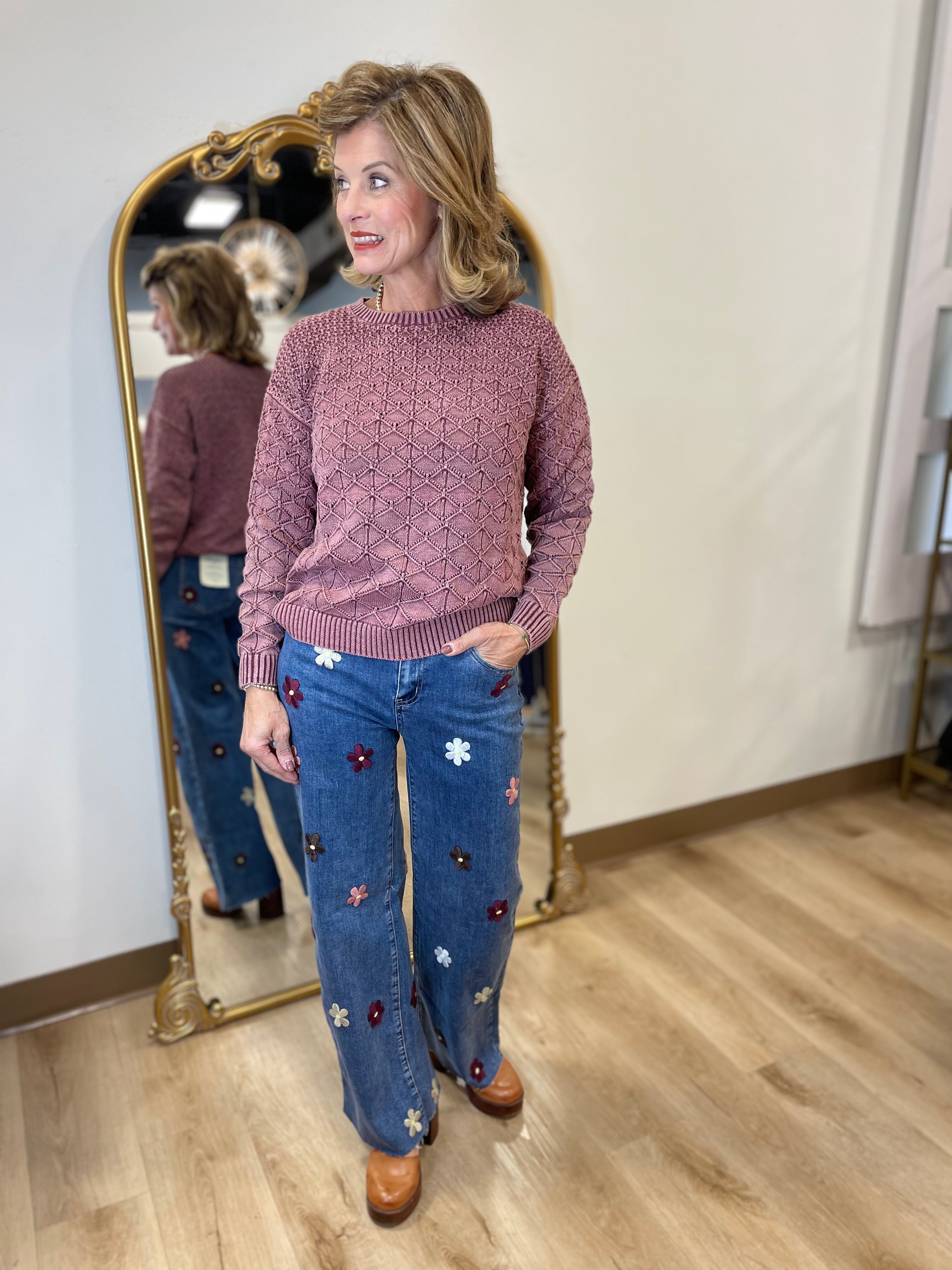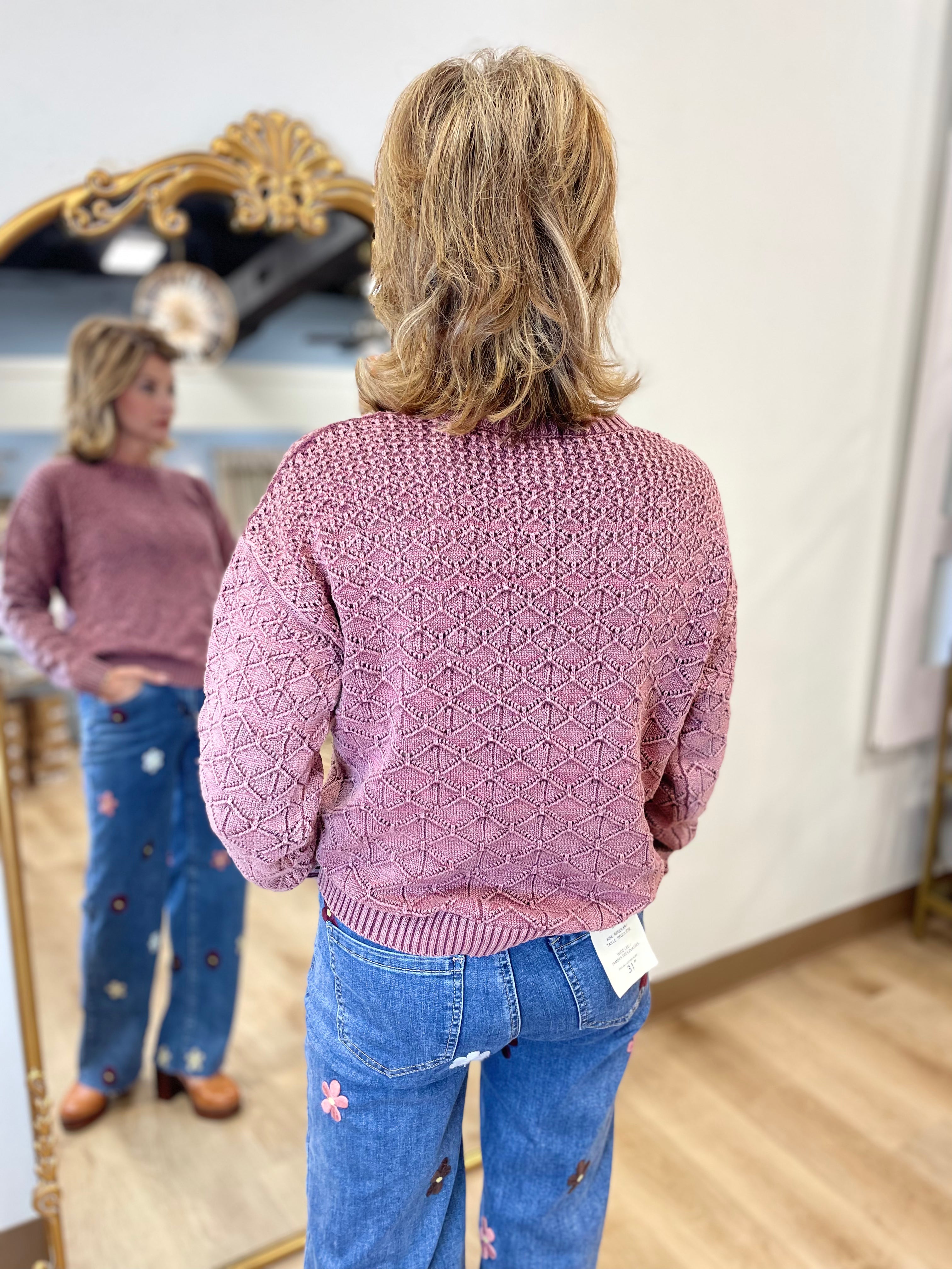 Charlie B Cold Dye Cotton Blend Pointelle Crew Neck Sweater Cabernet