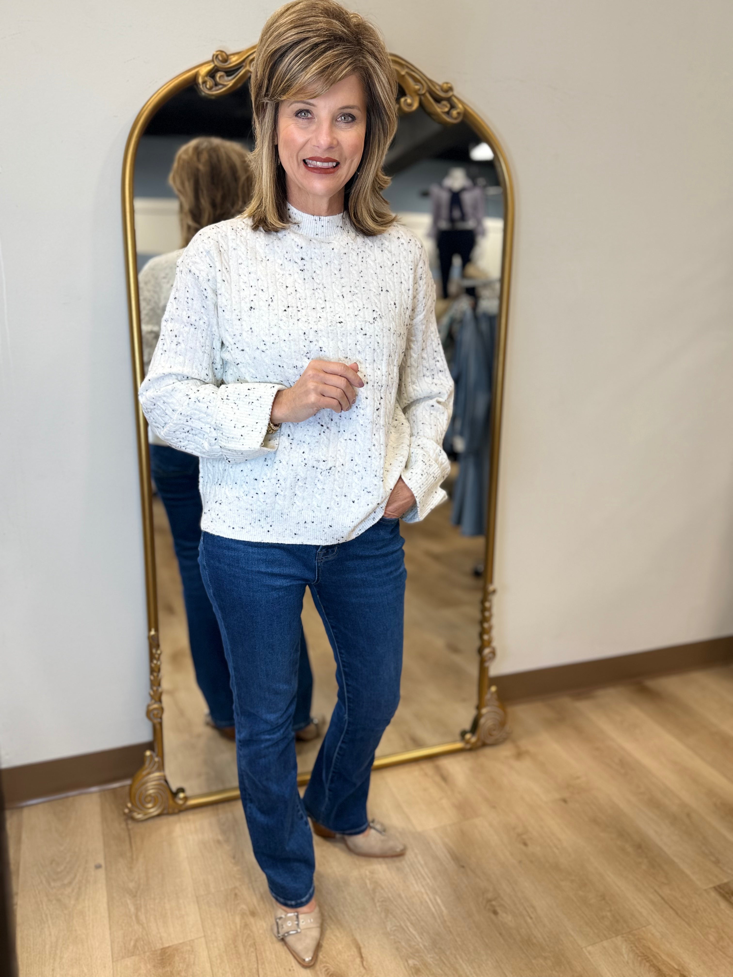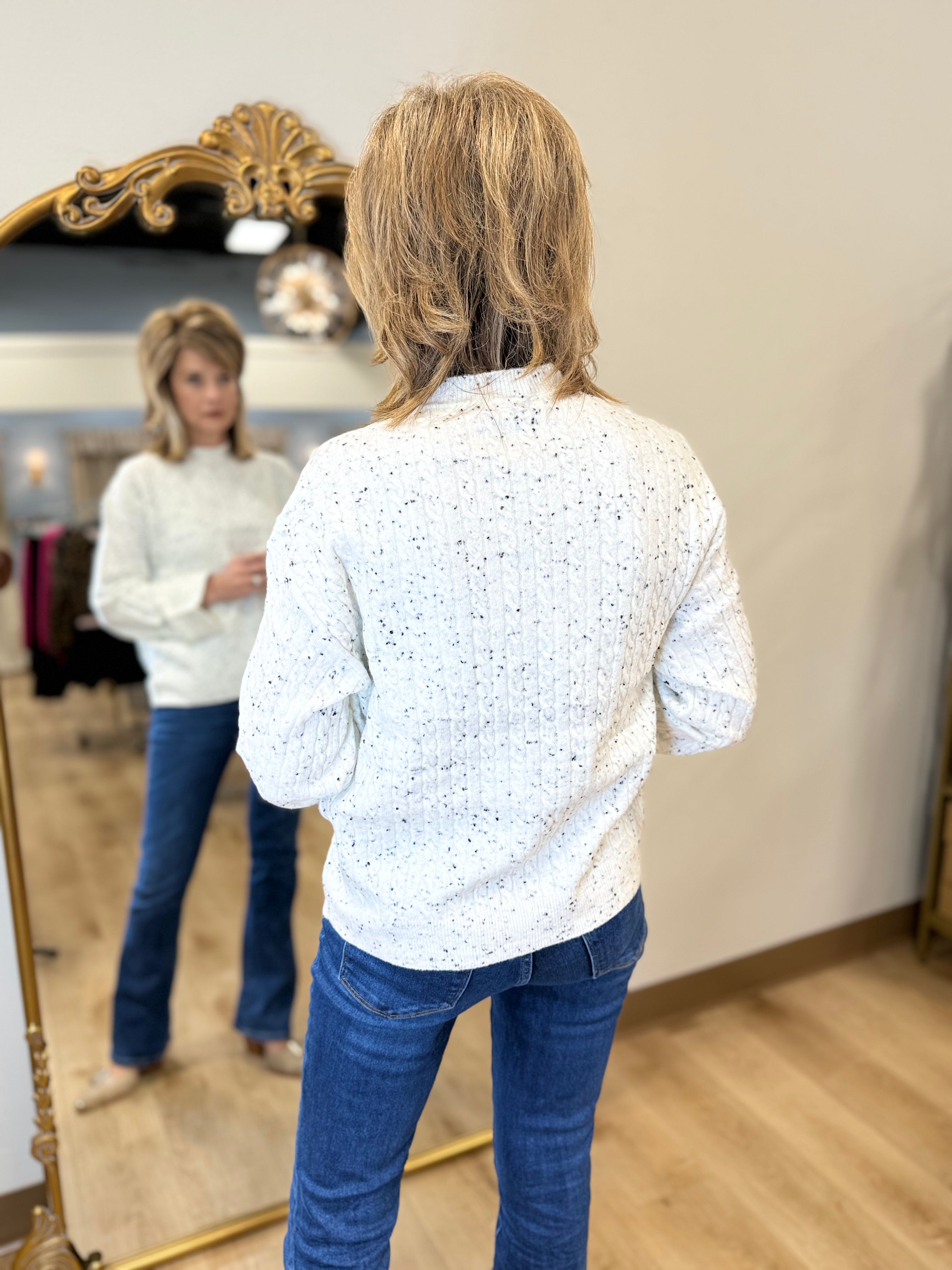Stay cozy and stylish this fall with our white speckled crew neck sweater. Designed with wide cuffs for a contemporary touch, this versatile sweater is ideal for both lounging at home and casual outings. The Cookie & Cream hue adds a chic modernity, ensuring you look great while feeling ultra-comfortable. Elevate your fall-winter wardrobe with this must-have sweater!