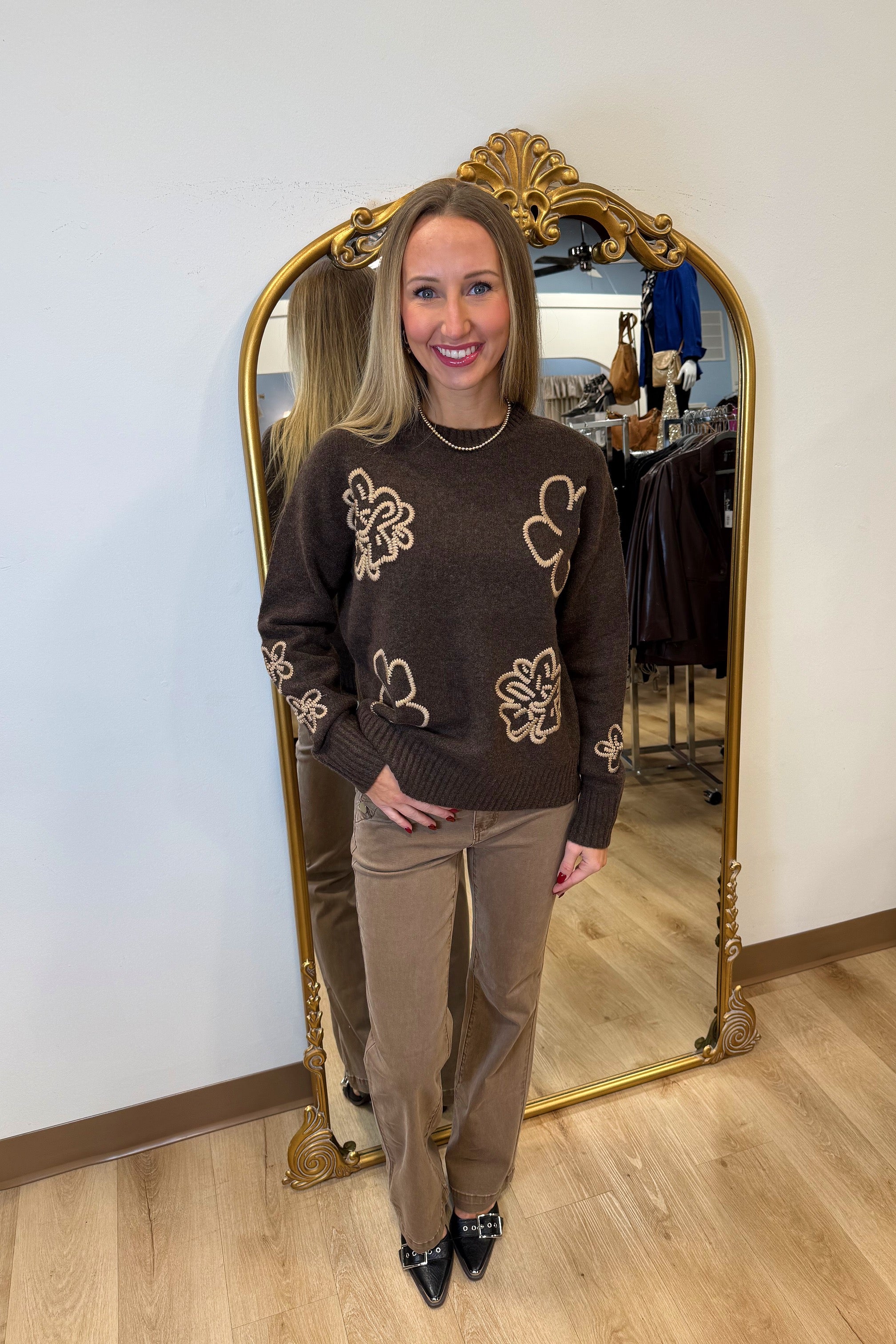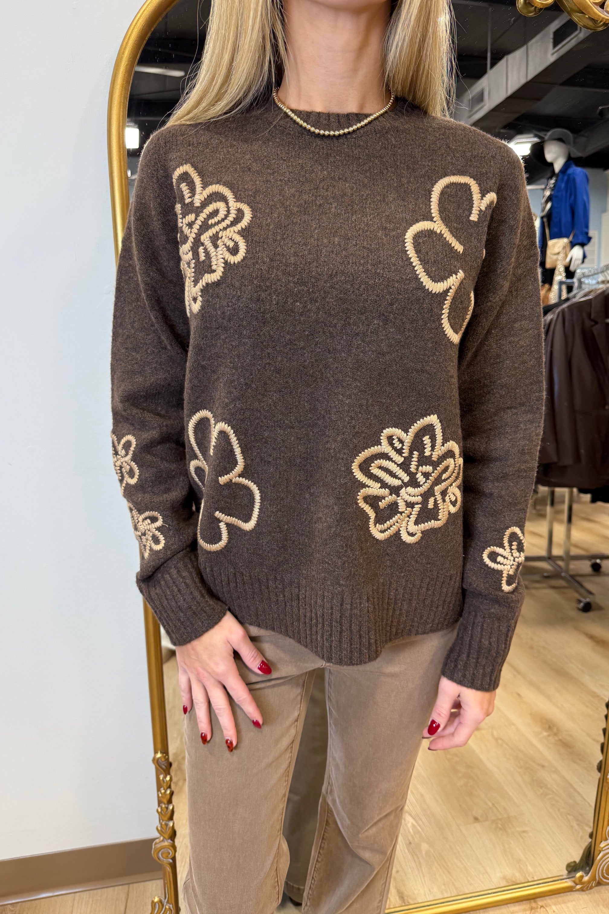 Welcome the season in style with our embroidered sweater in a chic heather brown hue. Crafted from soft, stretchy fabric, it perfectly balances warmth and fashion. The ribbed hem and cuffs ensure a timeless appeal, and the colorful embroidery adds a playful touch. Ideal for layering or wearing solo, it's a must-have versatile piece for your fall-winter collection.