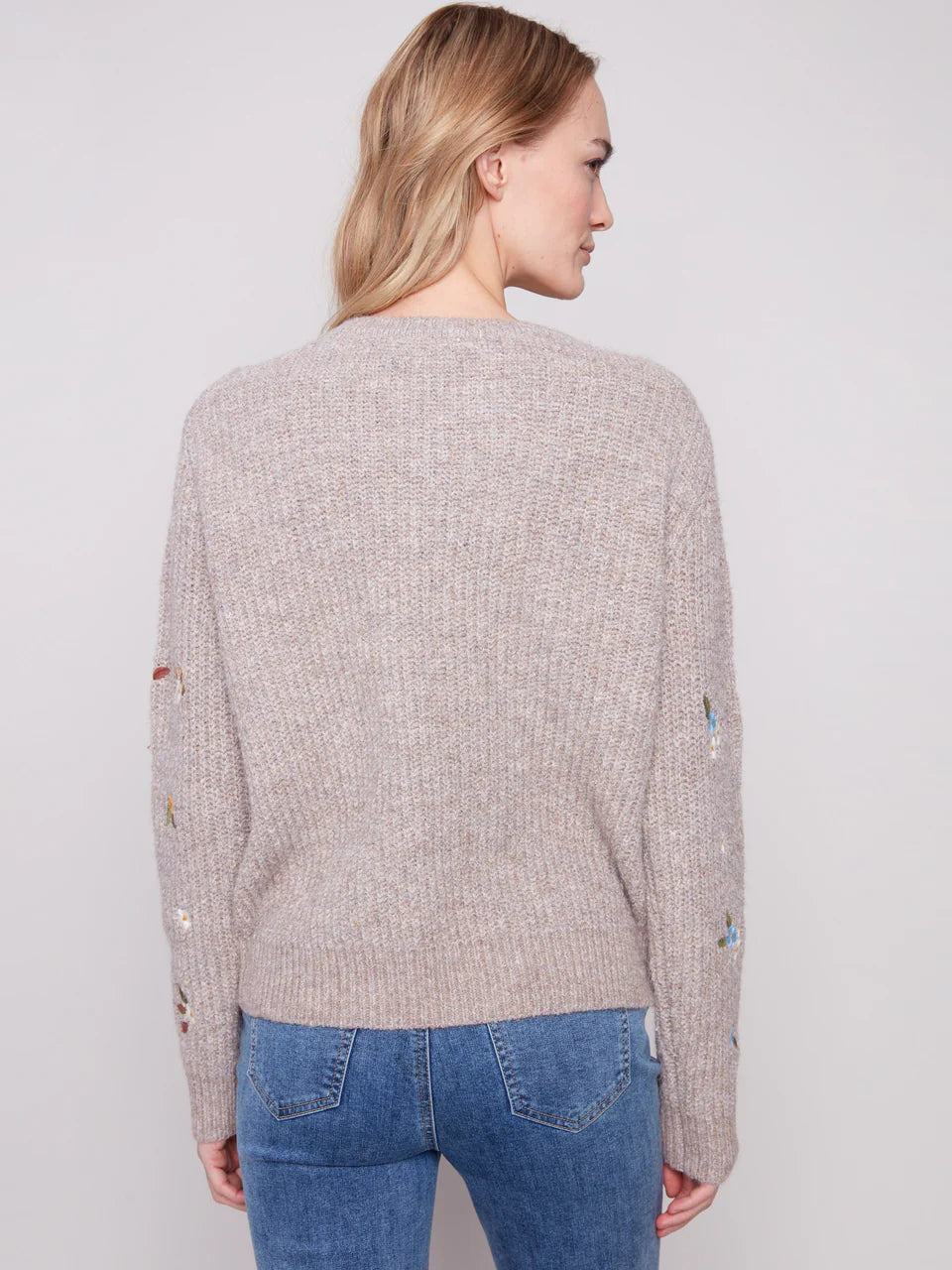 Stay cozy and chic with our Crew Neck Sweater, featuring exquisite floral embroidery on a soft, heather light brown backdrop. This elegant knit is designed for warmth on chilly days, perfectly pairing with your favorite jeans or skirt. Elevate your fal wardrobe with this stylish and versatile piece that combines comfort and elegance effortlessly.