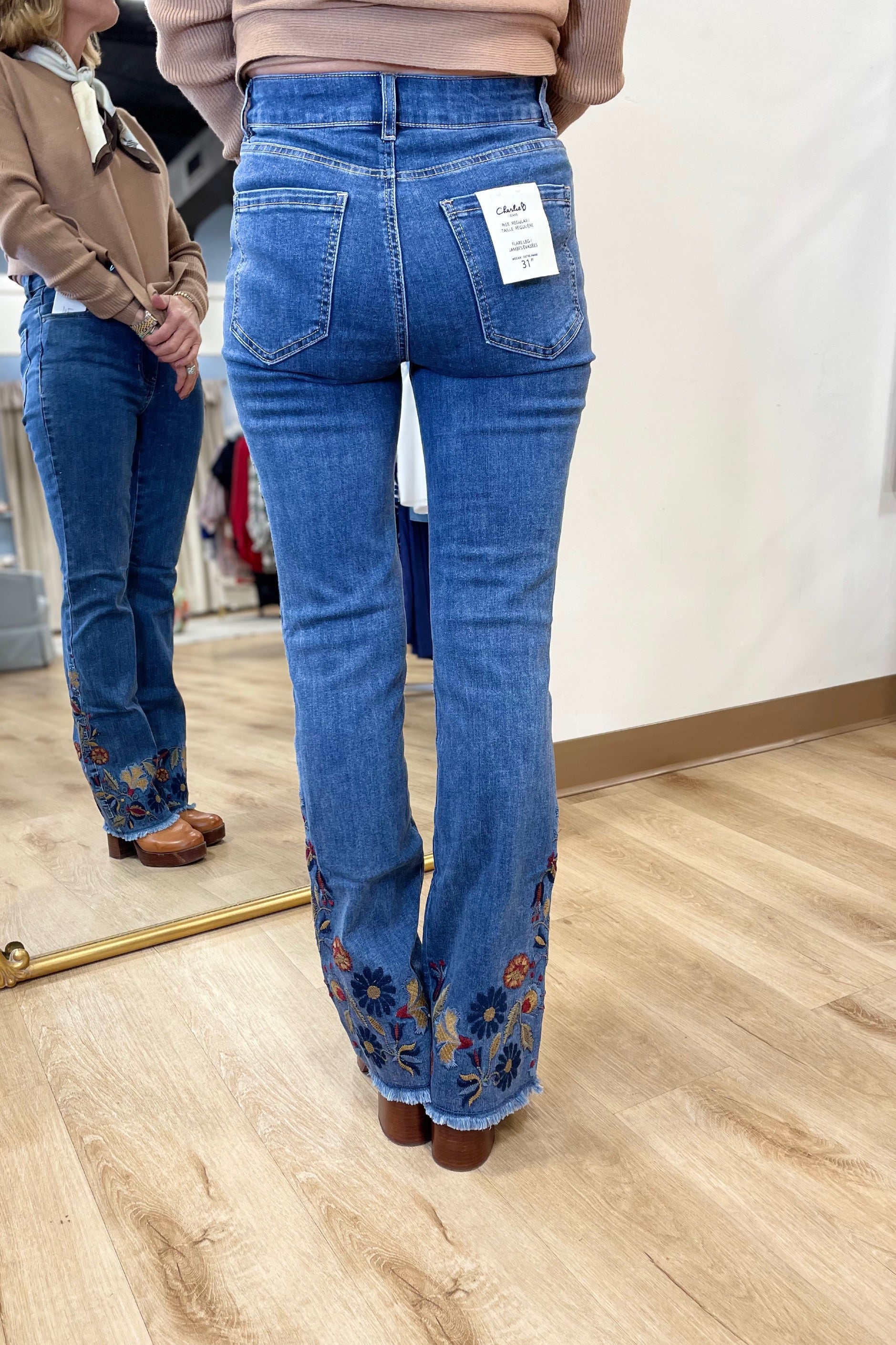 Charlie B Flare Leg Stretch Denim Stitch Colorful Embroidery Jean Medium Blue