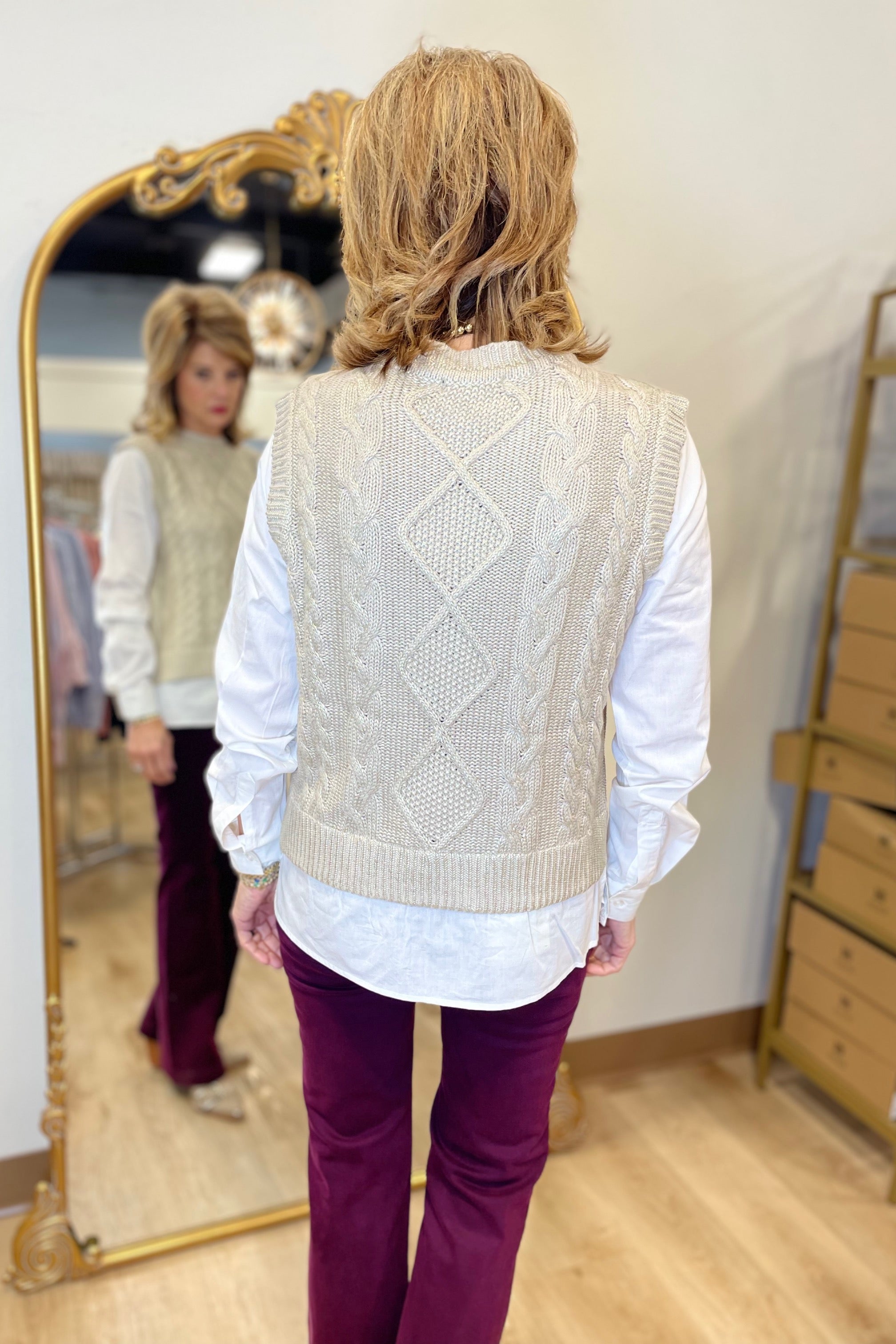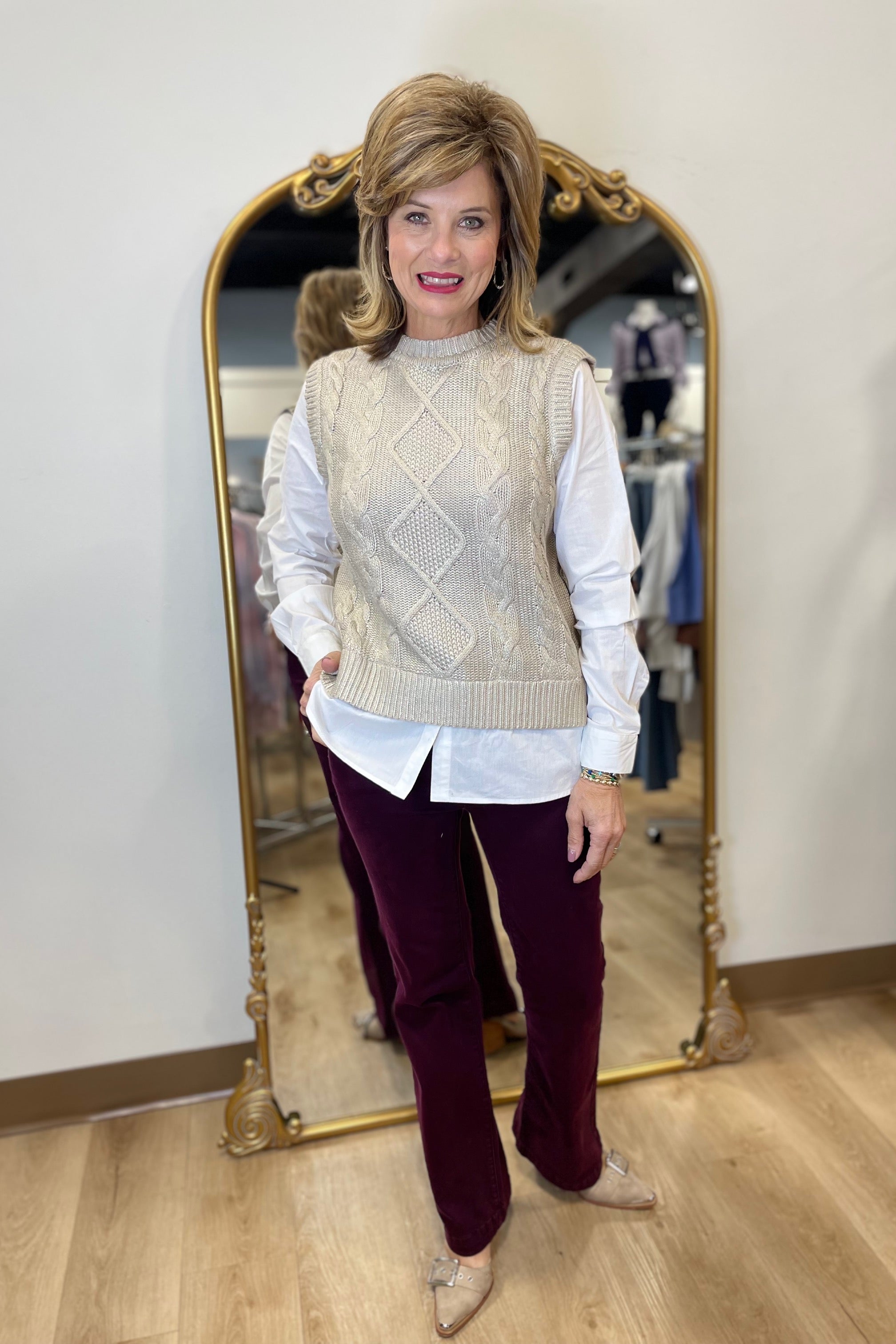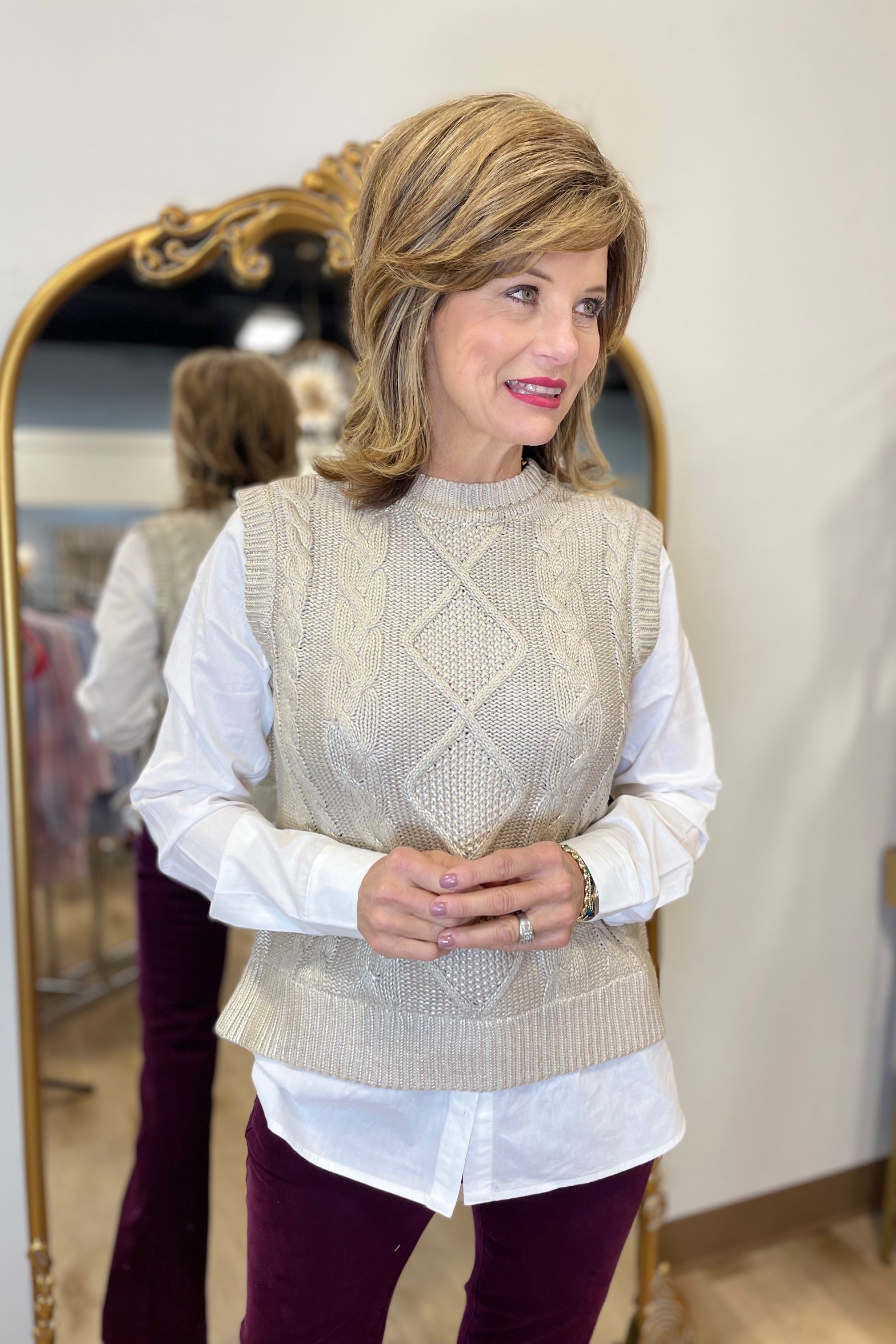 Elevate your fall style with this chic sweater vest. The foiled finish adds a subtle shine, while the classic cable knit brings texture and elegance. With its fooler layered effect at the sleeves and hem, it creates a stylish, layered look effortlessly with your favorite bottoms.