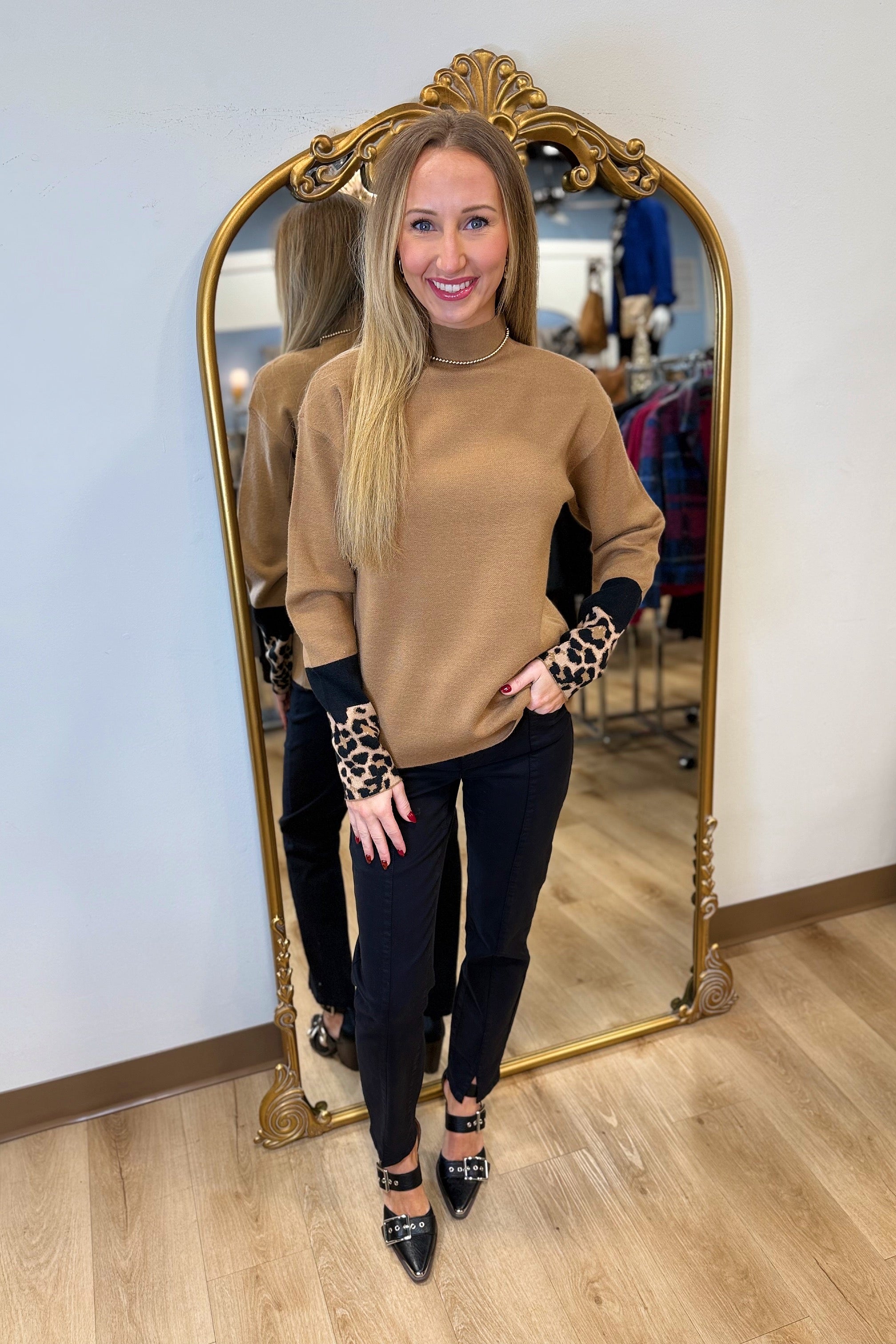 Indulge in ultimate warmth and style with our truffle brown funnel sweater, perfect for cozying up this fall. The charming animal print accents on the sleeves bring a stylish twist to your ensemble. Ideal for casual outings, it pairs effortlessly with jeans or skirts, creating a chic, versatile look that’s sure to turn heads.