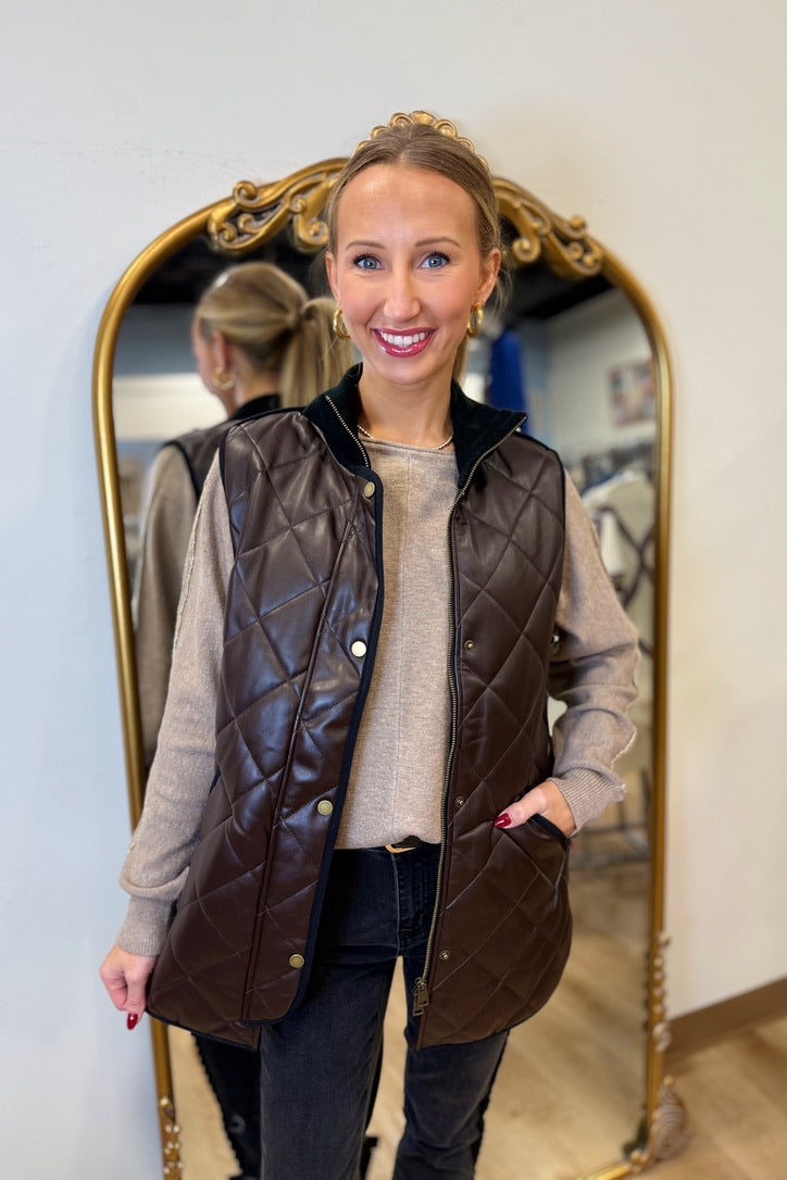 Charlie B Long Quilted Faux Leather Vest Mocha