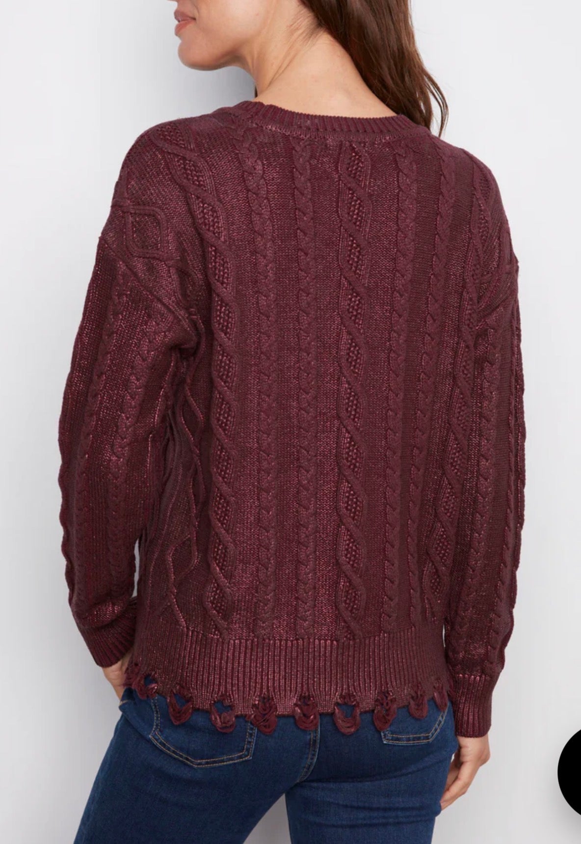 cabernet red. Made from soft cotton, it offers a relaxed fit with a radiant metallic finish. The cable knit pattern adds texture and depth, ensuring you stand out anywhere. Perfect to pair with jeans or skirts for a chic and sophisticated look.