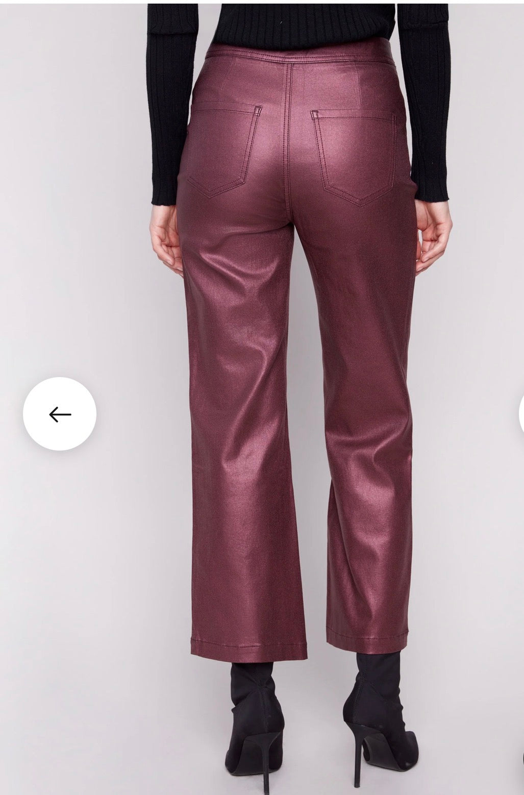 Metallic Wax Flared Pants in rich Cabernet red are perfect for stepping up your style. They feature an eye-catching metallic finish that gleams as you move. With a flare leg design and front welt pockets, they offer a modern touch suitable for evenings out or special events. Pair them with either a sleek top or a cozy knit to make a statement this fall.