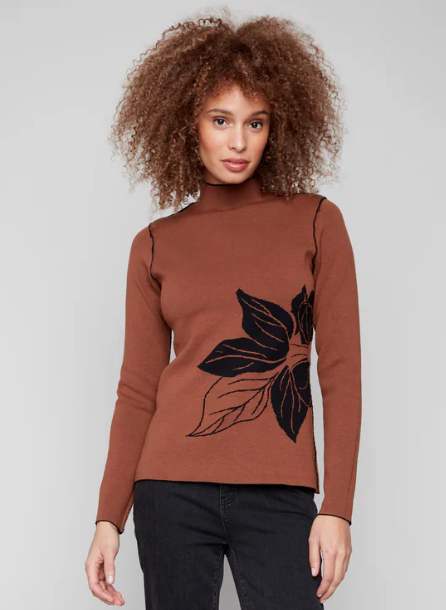 Fall in love with the versatility of this reversible sweater. Featuring an elegant leaf pattern and a chic mock neck, one side has a black base with brown cacao leaves, while the other side reverses to a brown cacao base with black leaves. Made from a soft, cozy blend, it’s the perfect piece for stylish and comfortable autumn outings — two looks in one!