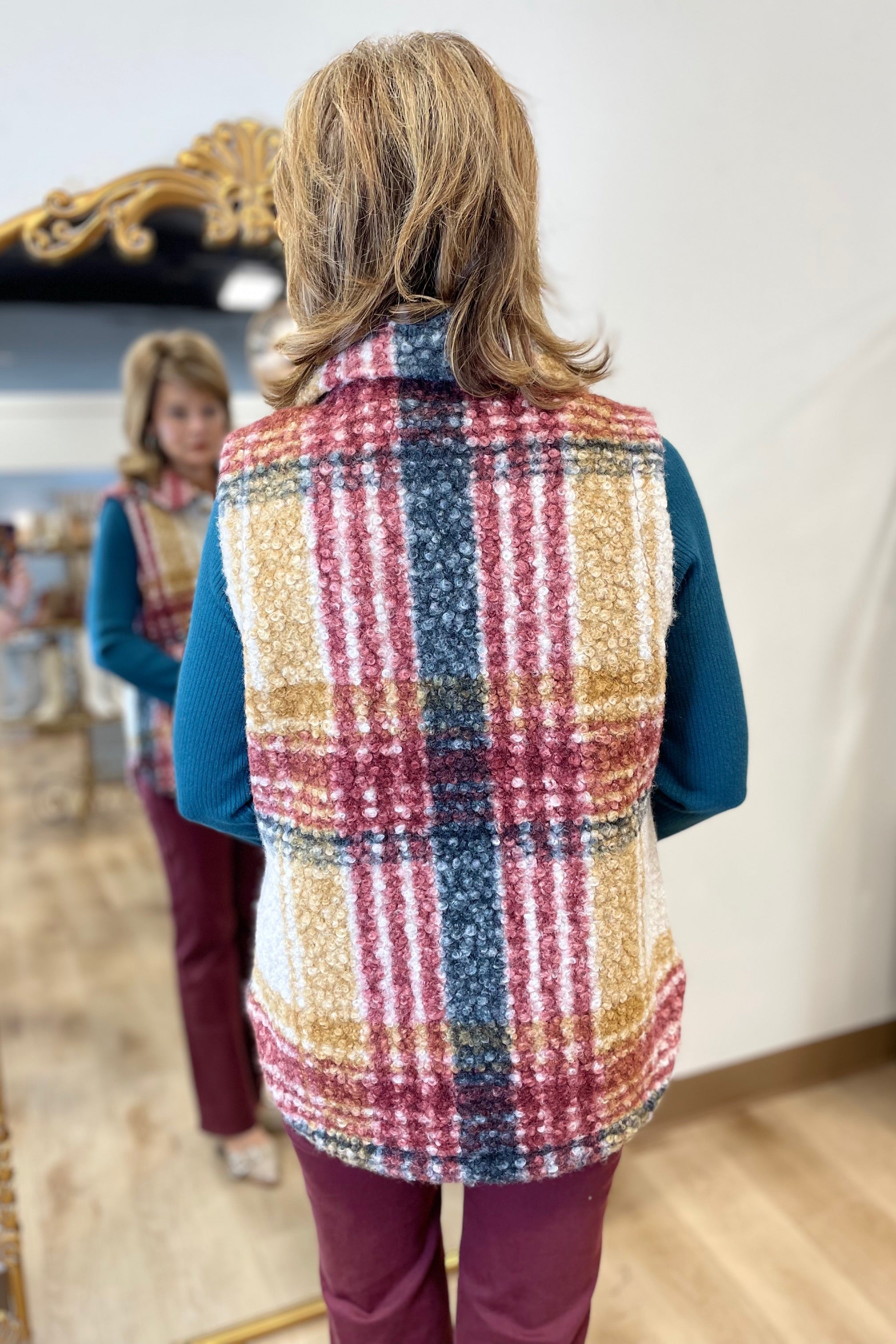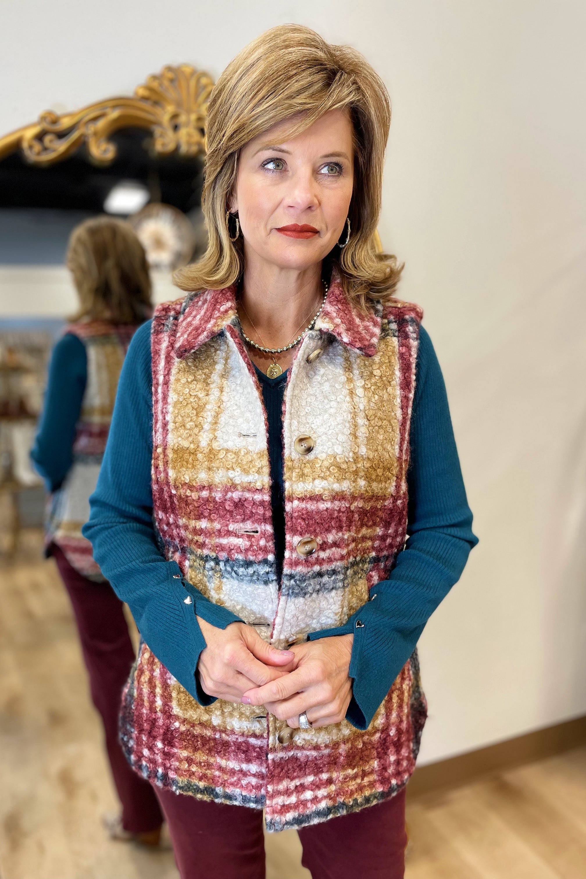 Charlie B Plaid Boucle Knit Vest Jacket Cabernet