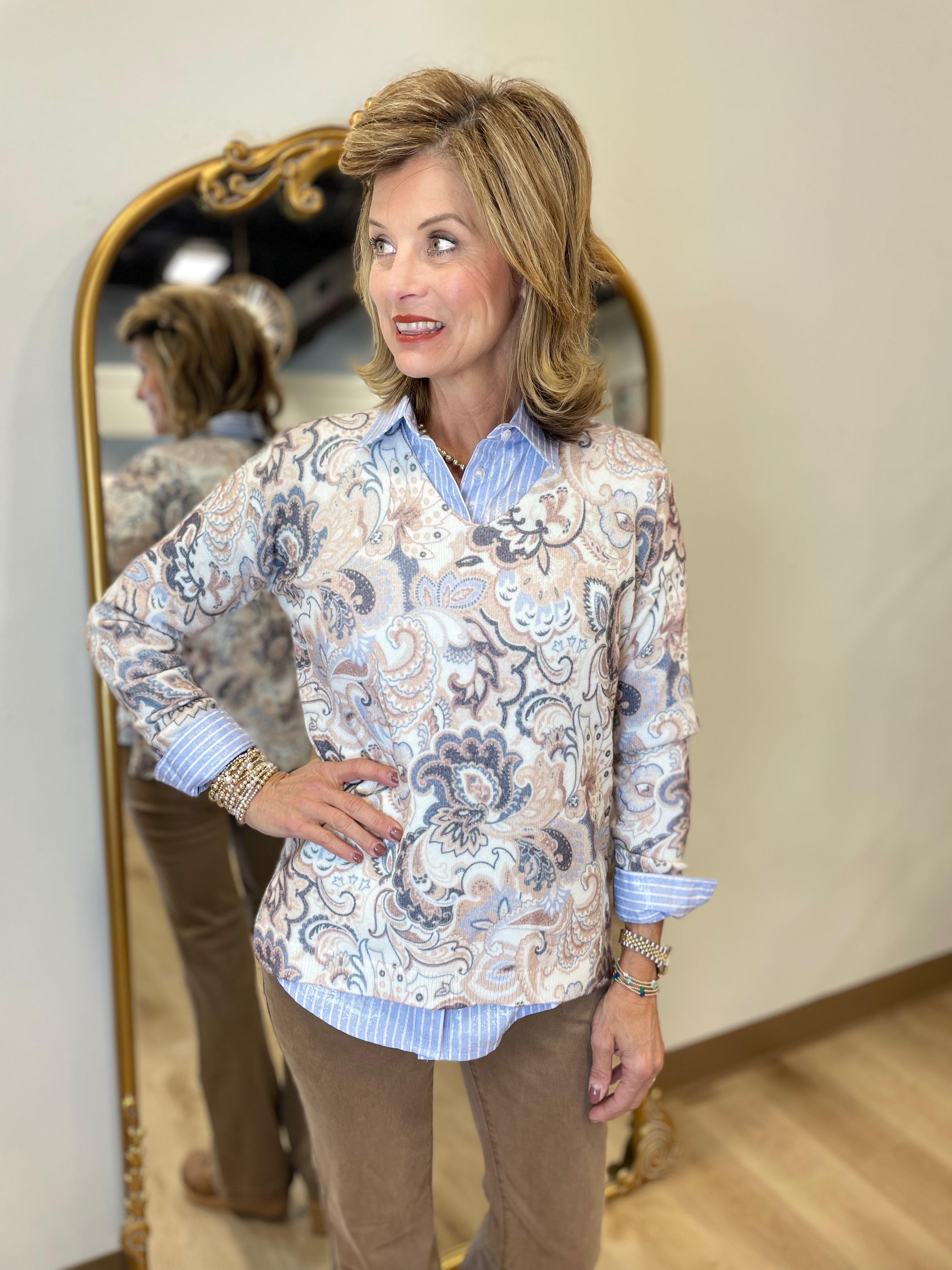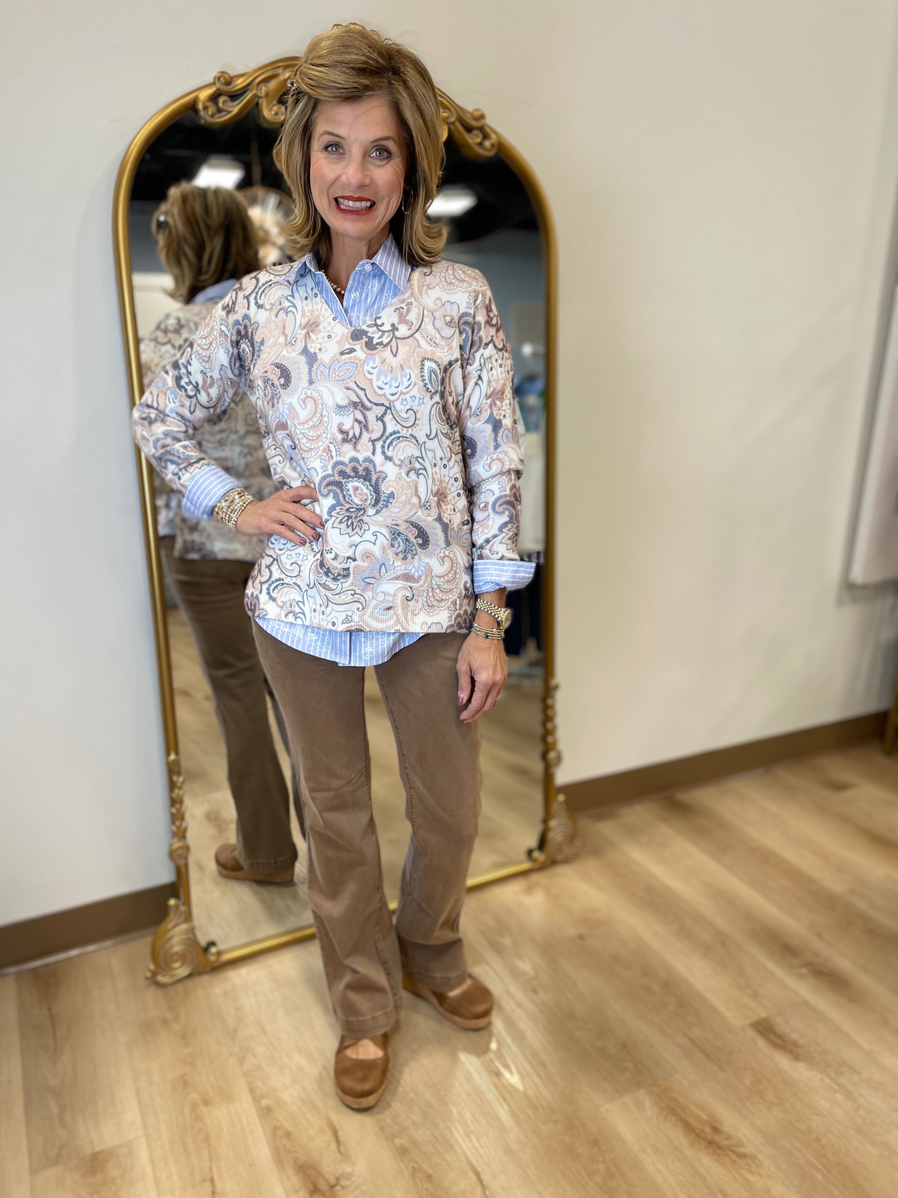 Pictured here w Charlie B Flare Leg Jean with Buttons Truffle & Renuar Bluebell Combo Shirt.