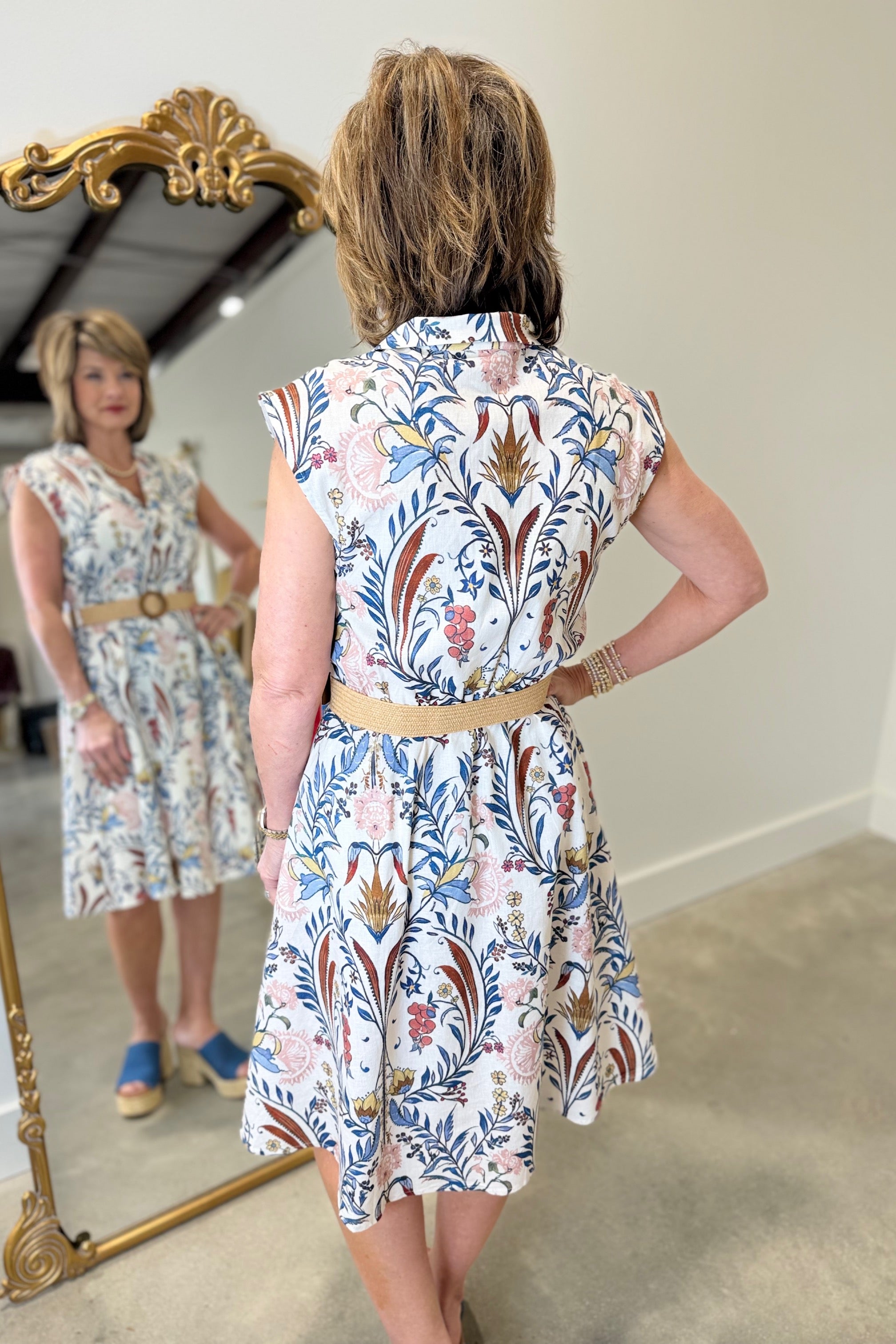 Charlie B Printed Linen Cap Sleeve Dress w Straw Belt