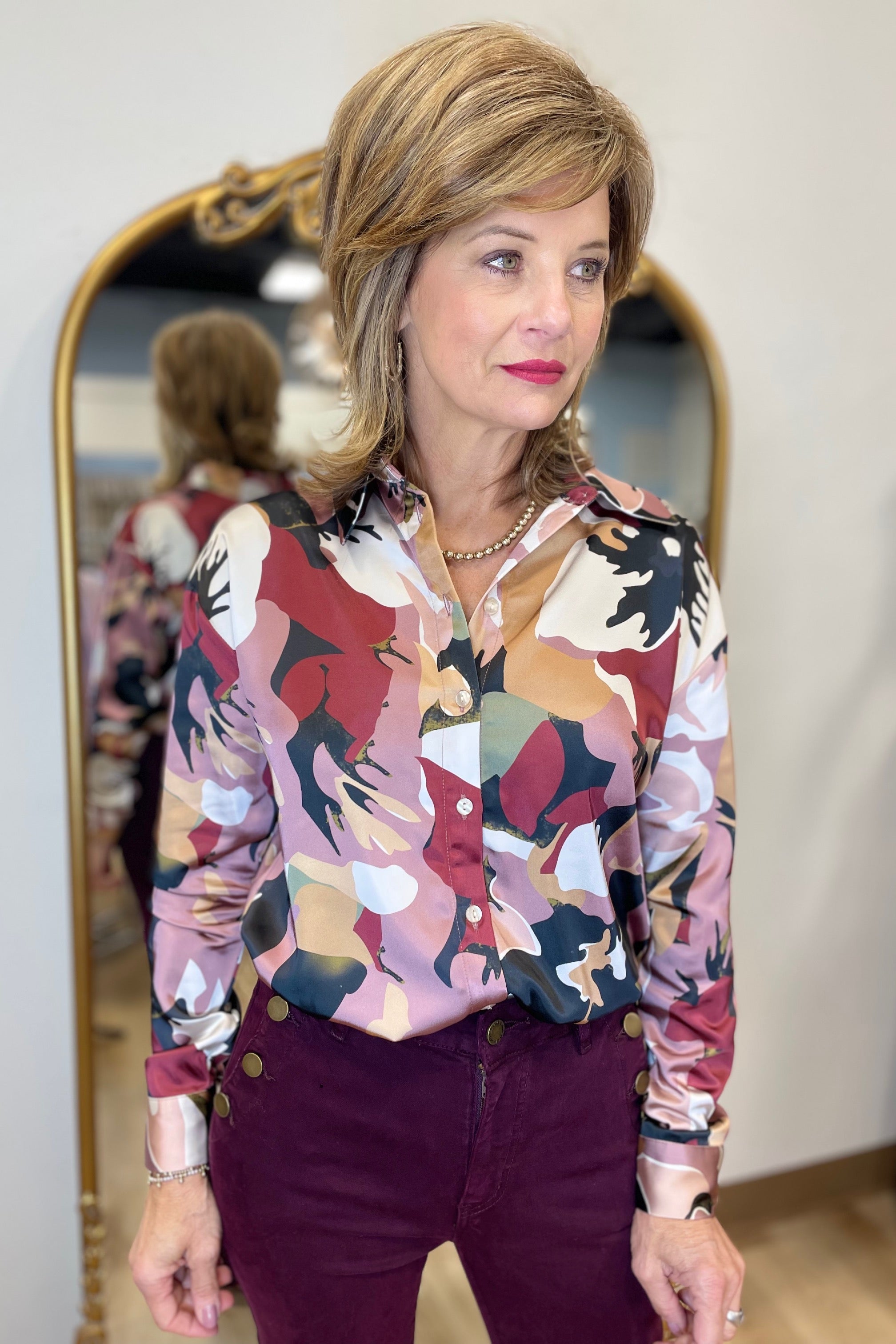 Embrace elegance this fall with our printed satin button-down shirt, featuring a striking all-over flowery design. With its luxurious satin texture and effortlessly stylish relaxed fit, this shirt is a versatile wardrobe essential.