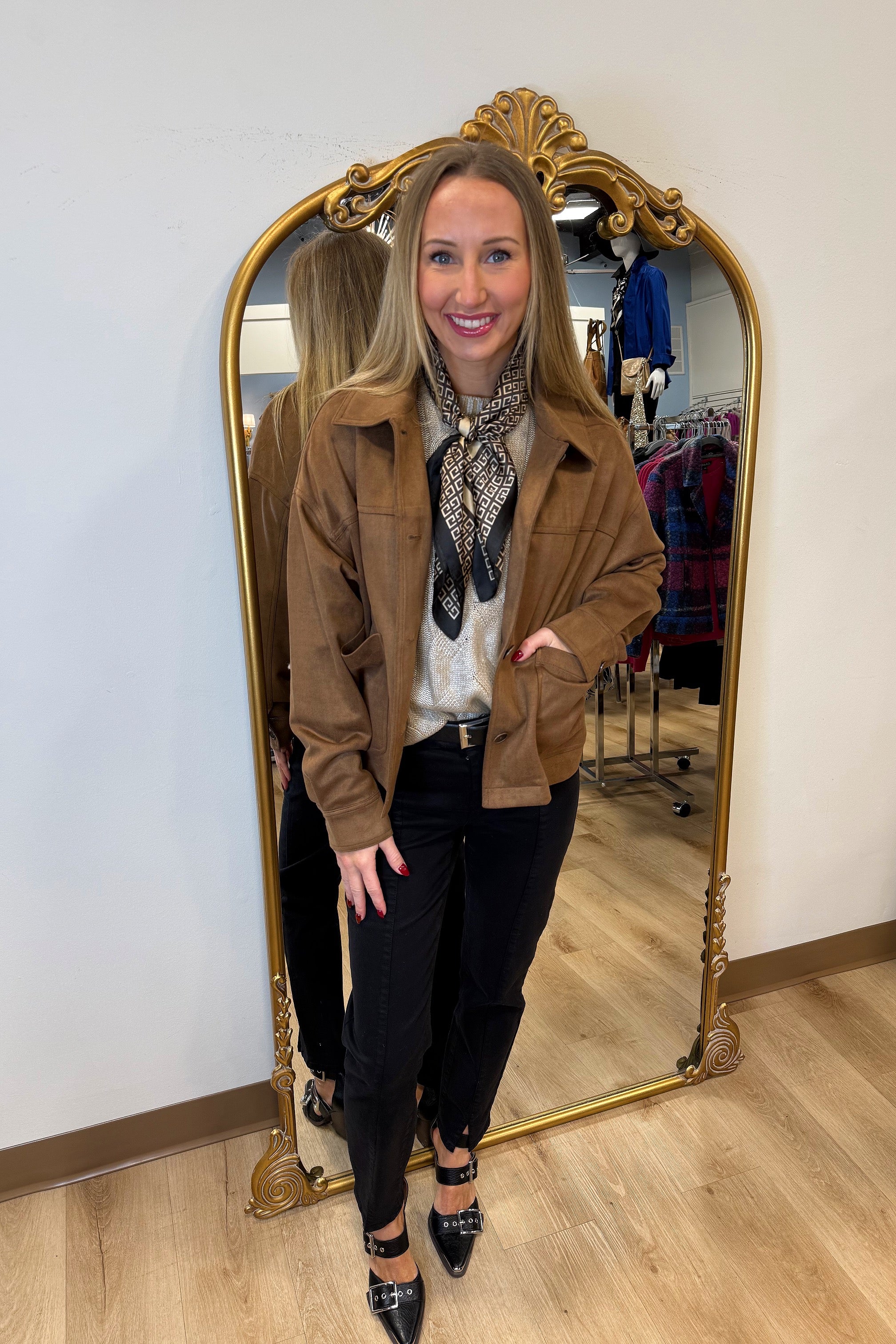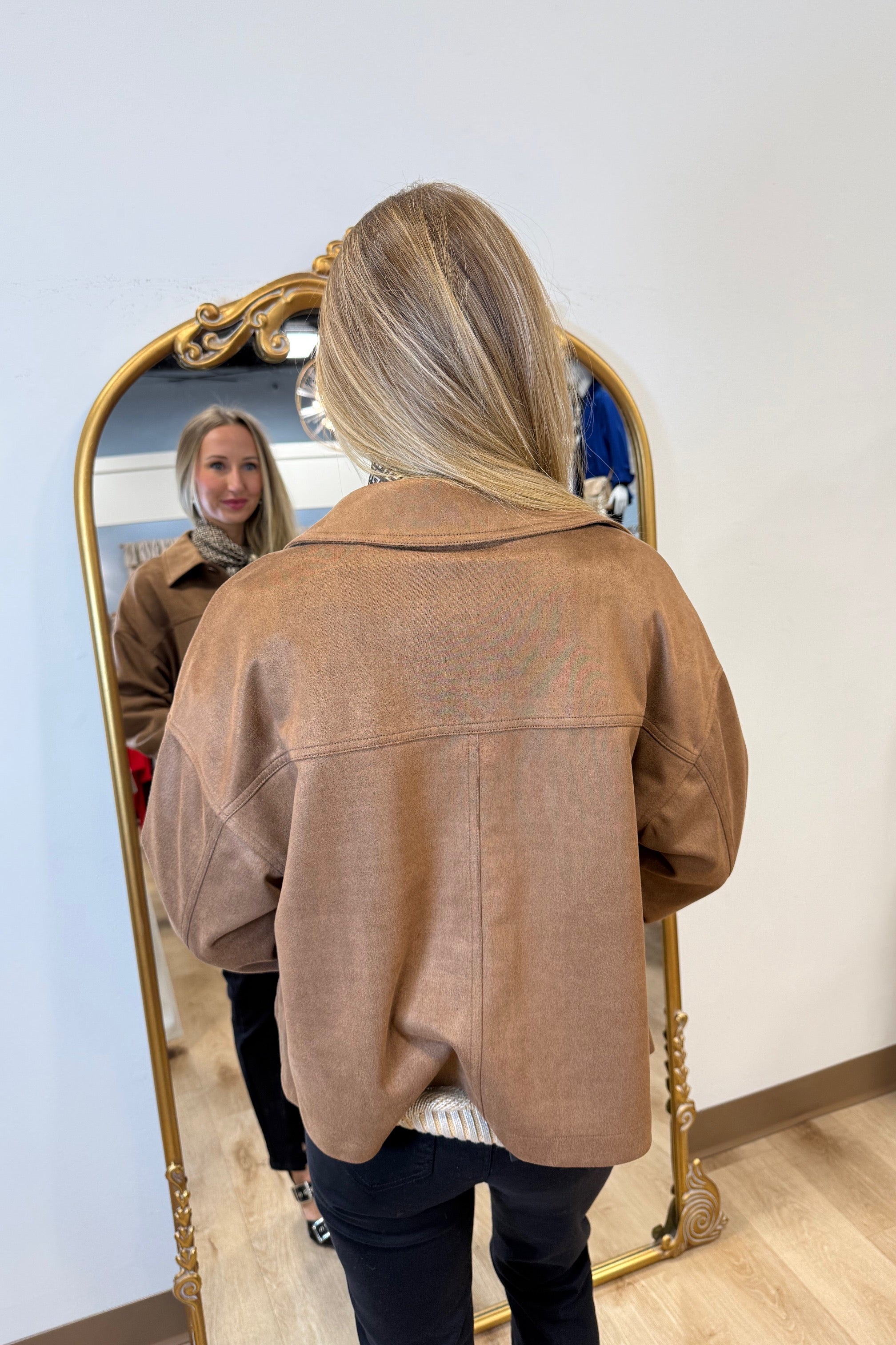 Embrace elegance with this faux suede jacket. Its truffle brown color and luxurious texture make it ideal for enhancing any outfit. The stretch fabric and button cuffs offer comfort and style. Whether you're off to a casual lunch or an evening walk, this piece is versatile and chic.