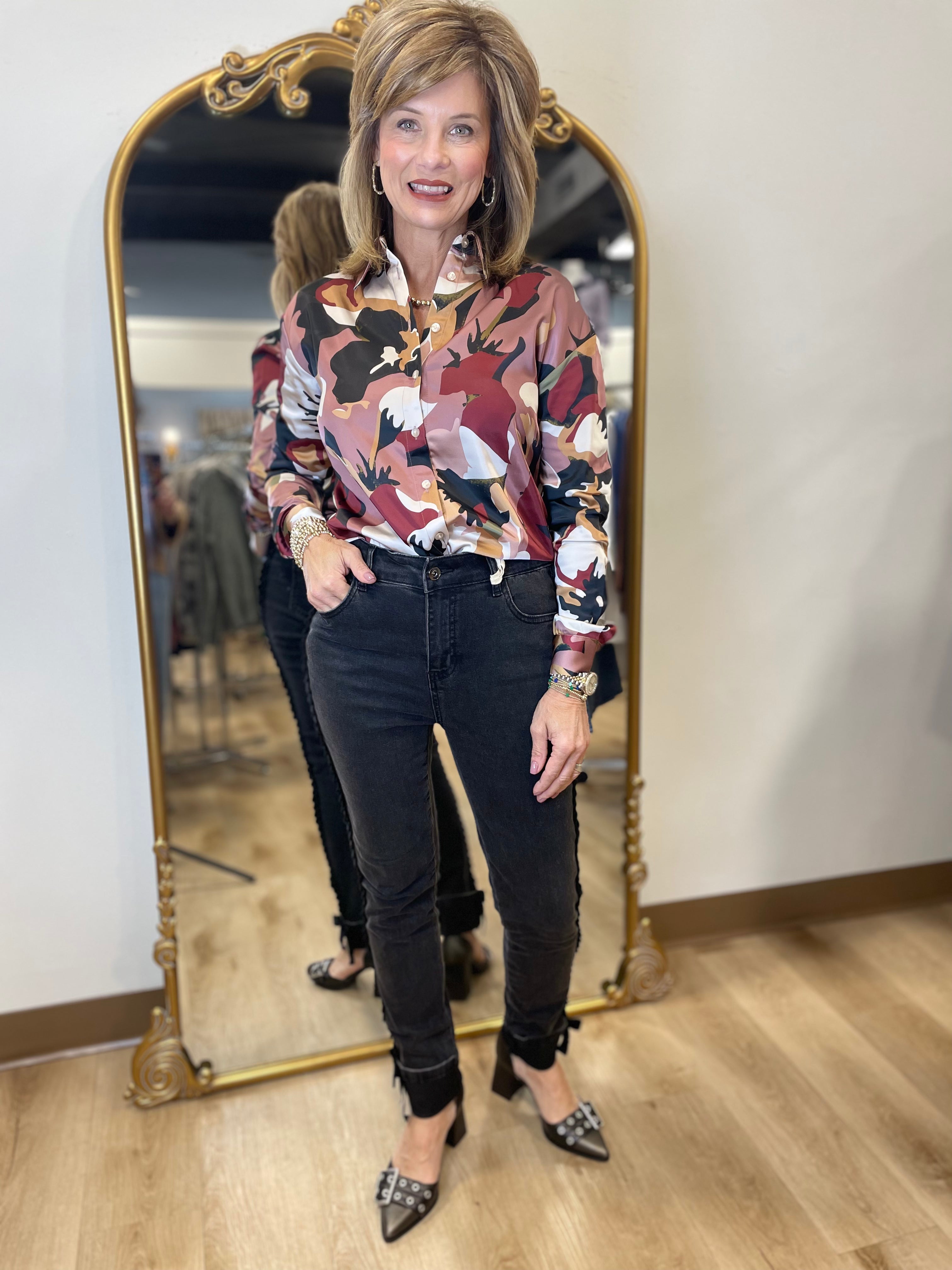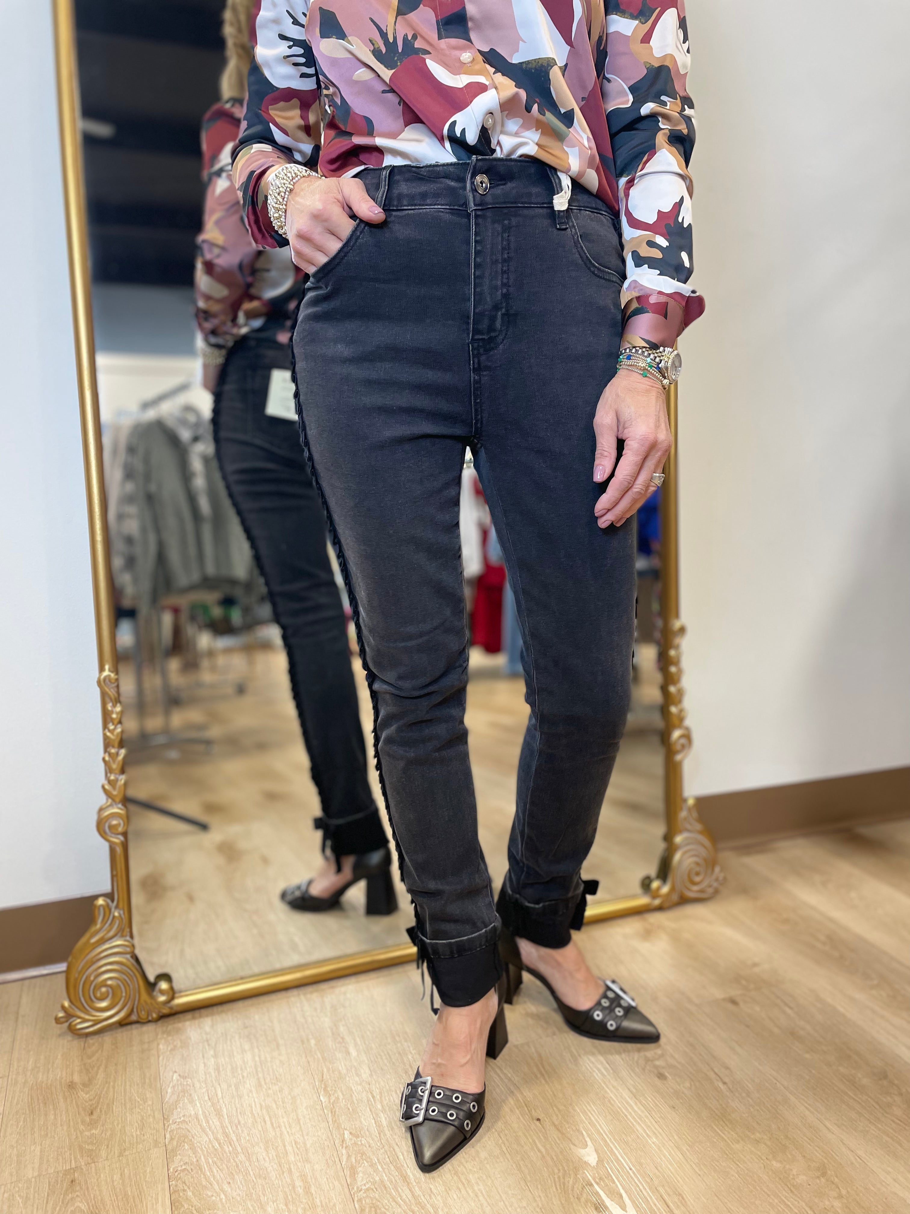 Elevate your wardrobe with our charcoal black Slim Leg Jeans, adorned with an elegant velvet bow detail along the side seams and finished with a folded hem for a polished, tailored touch. Crafted from comfortable stretch denim, they offer ease of movement without compromising style. Featuring a regular rise and a classic five-pocket design, these jeans effortlessly blend practicality with sophistication. A must-have for your fall lineup.