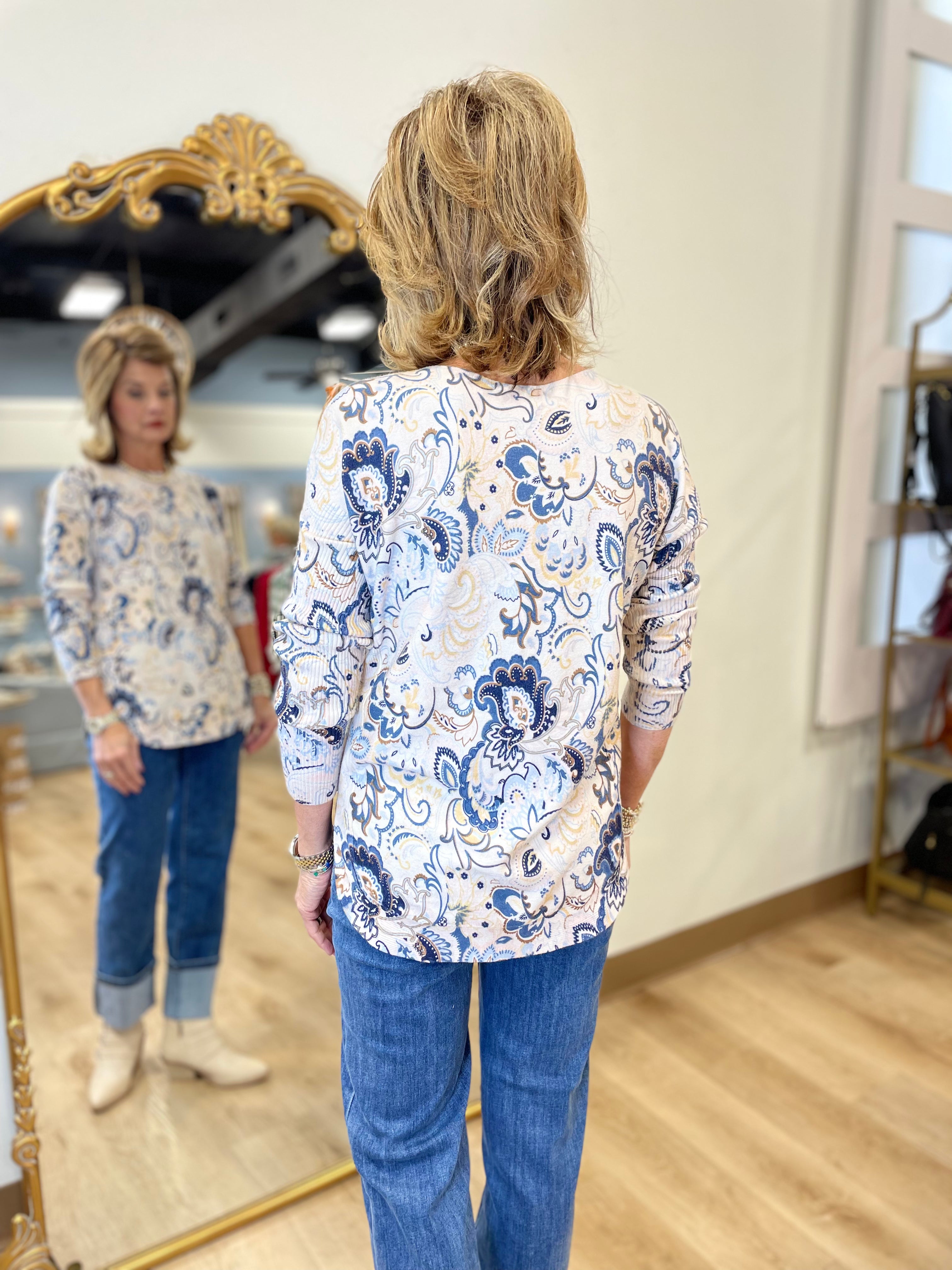 Charlie B Printed Long Sleeve Boat Neck Sweater w Pockets Blush