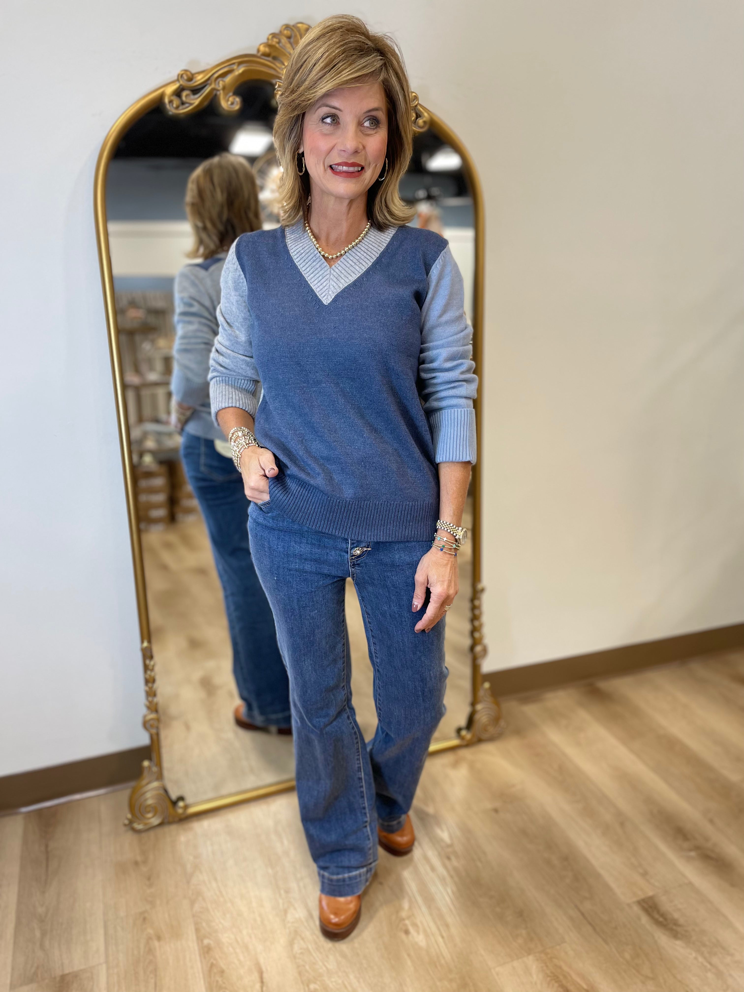 Charlie Colorblock V Neck Sweater w Wide Rib Cuff and Hem Moonlight