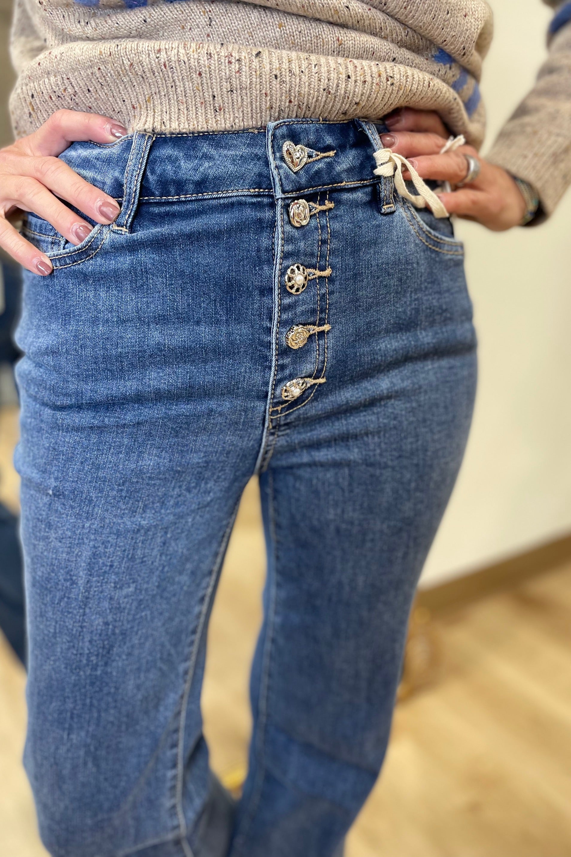 Charlie B Wide Leg Stretch Embellished Buttons Jean Medium Blue