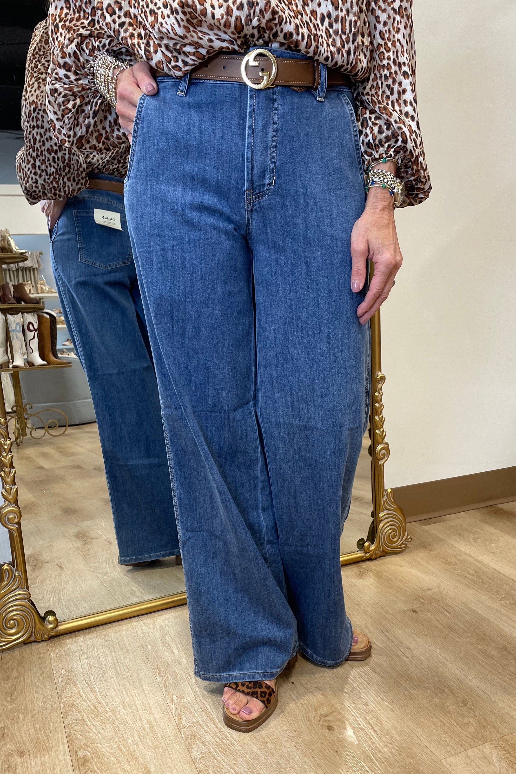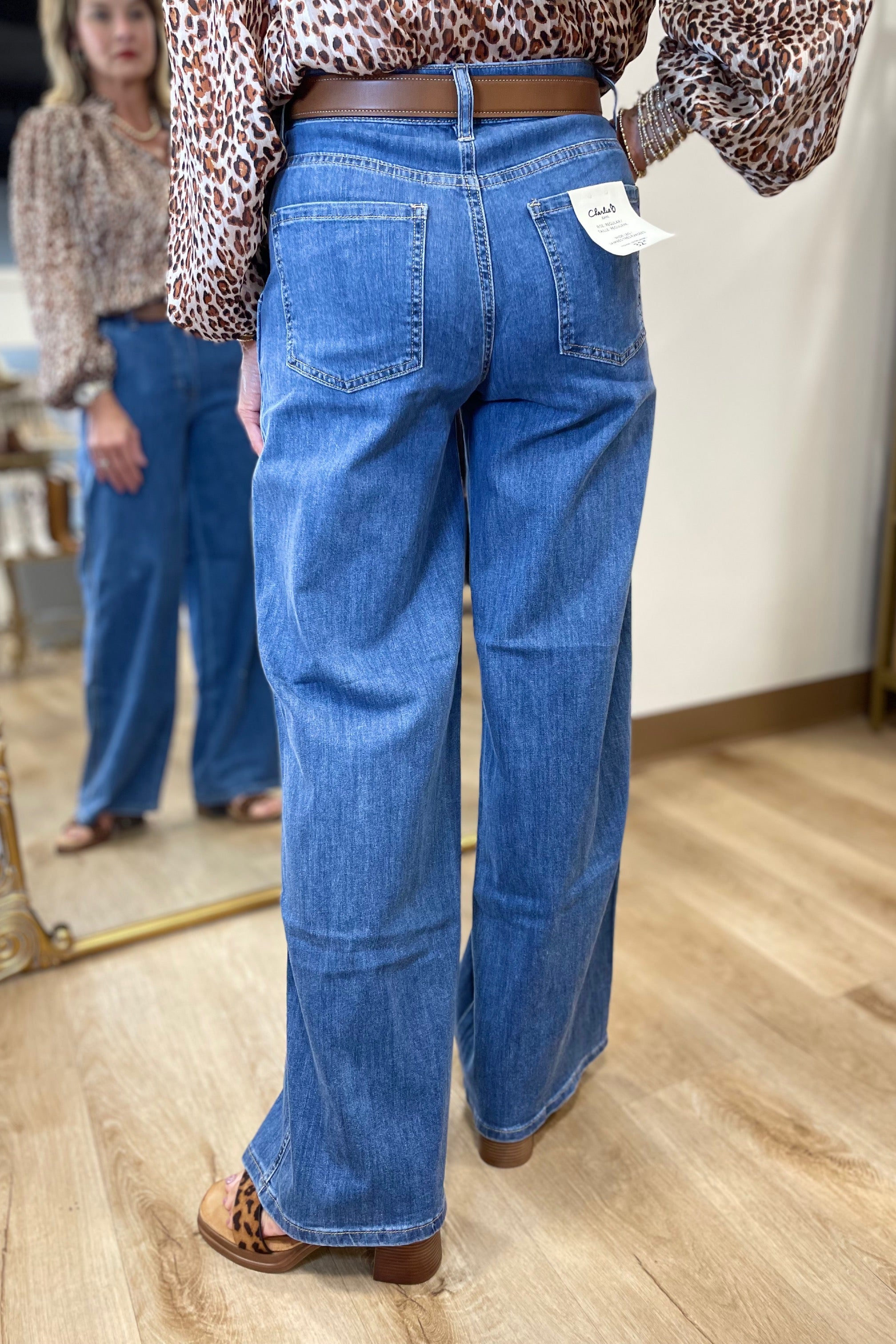 Charlie B Wide Leg Stretch Denim Pant w Slash Pockets Classic Blue.