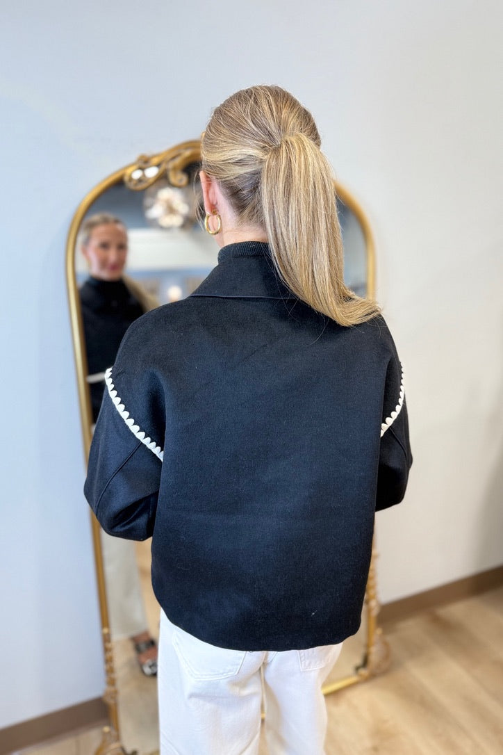 This sophisticated double-faced wool jacket enhances your look. The structured design and classic button front closure create a polished silhouette, while the elegant black color offers versatility. Each detail, from the soft wool blend to the artisanal white blanket stitch, is crafted to perfection. It's an essential fall piece for timeless style.