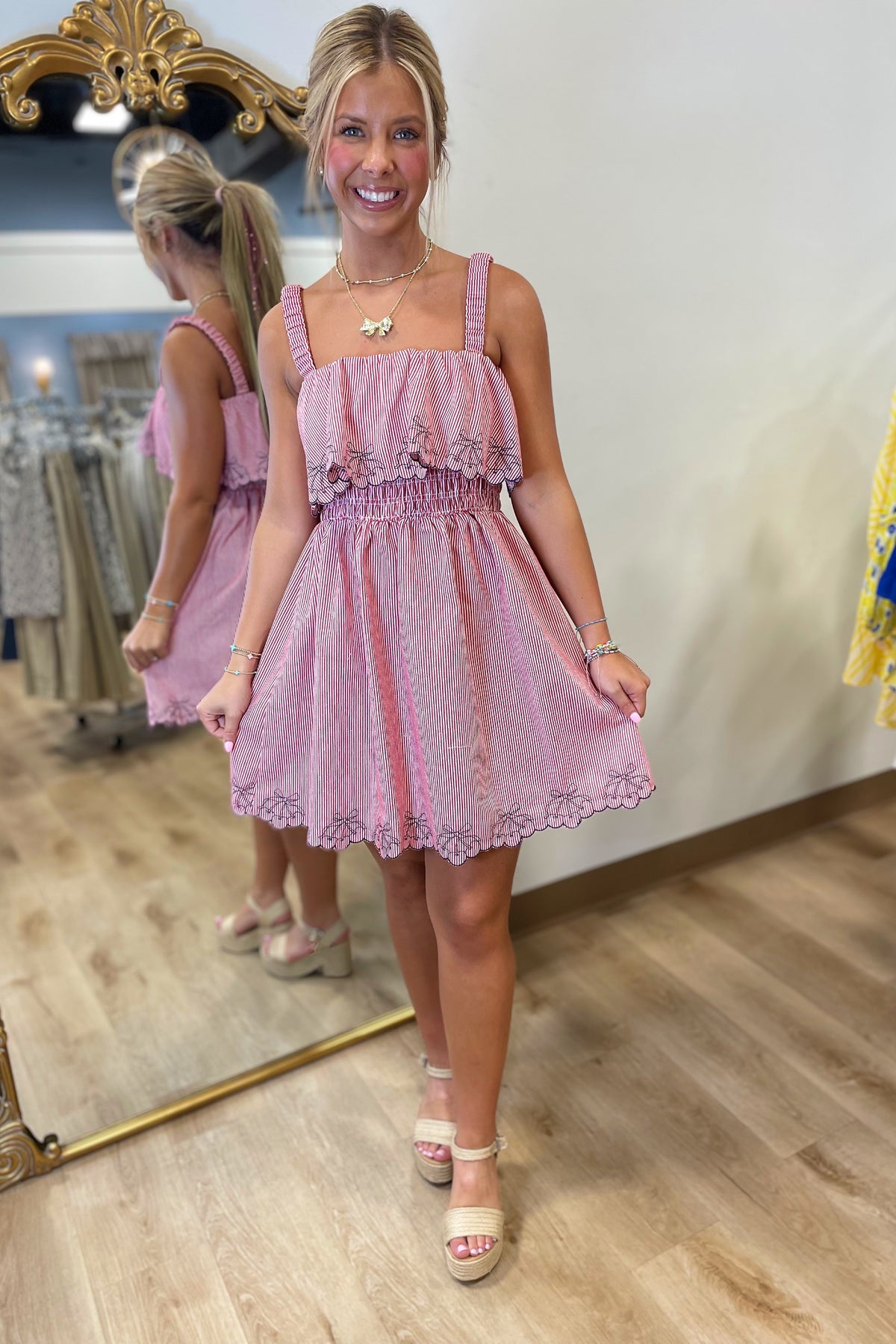 Cherry Picking Sleeveless Denim Stripe Ruffled Dress w Cherry Embroidered Detail