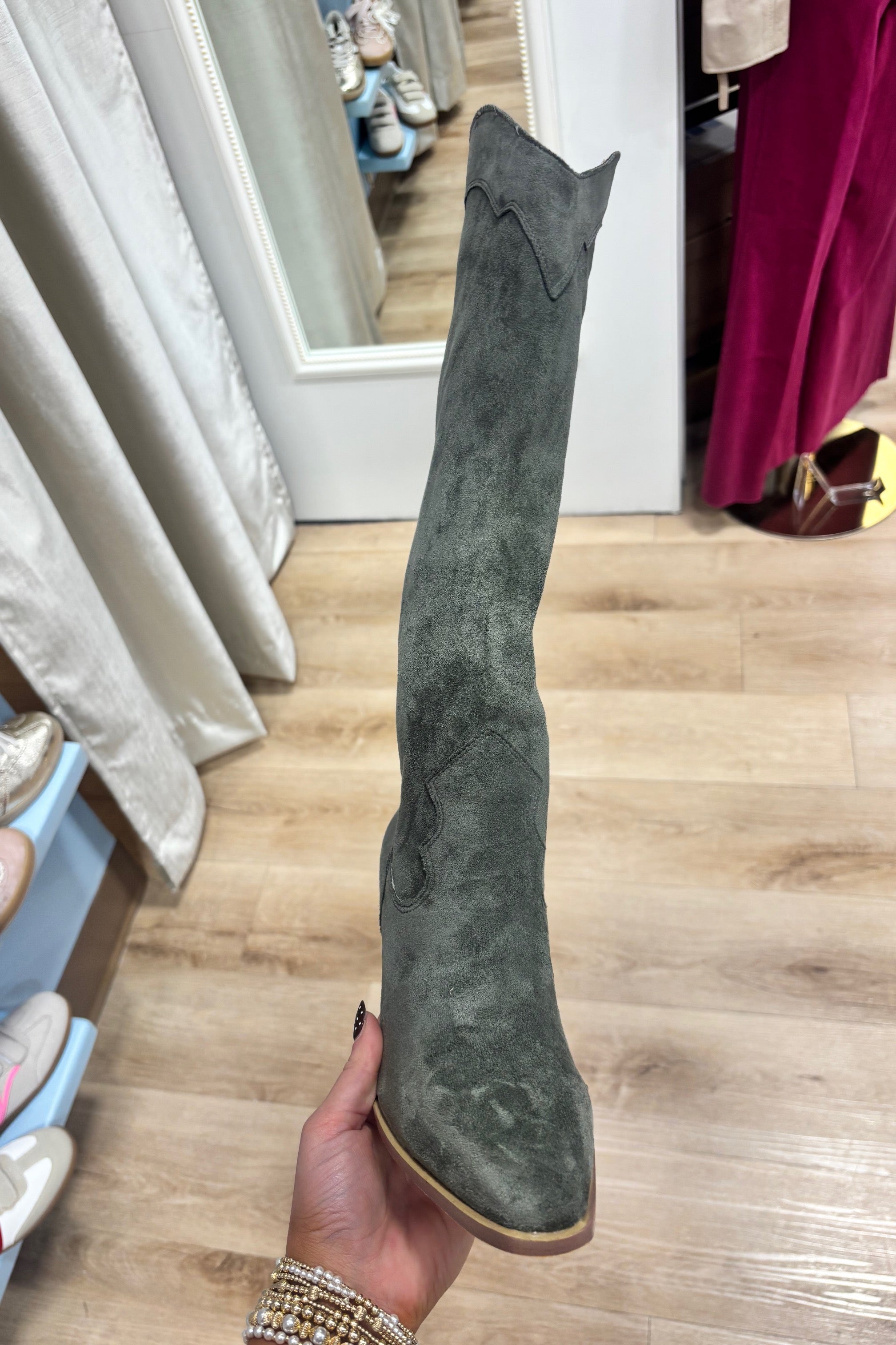 A western boot is a must for every wardrobe. Get ready to turn heads as you step out in the CLASSY Western Knee-high boots! The suede design of Classy ensures a lasting fit for everyone. With their stacked mid-block heel, these boots add just the right amount of height to your stride, guaranteeing you'll make a statement no matter where you go! PRODUCT DETAILS: *ALMOND TOE *SYNTHETIC SOLE *PADDED FOOT BED *PULL ON *MAN-MADE UPPER *100% GENUINE SUEDE