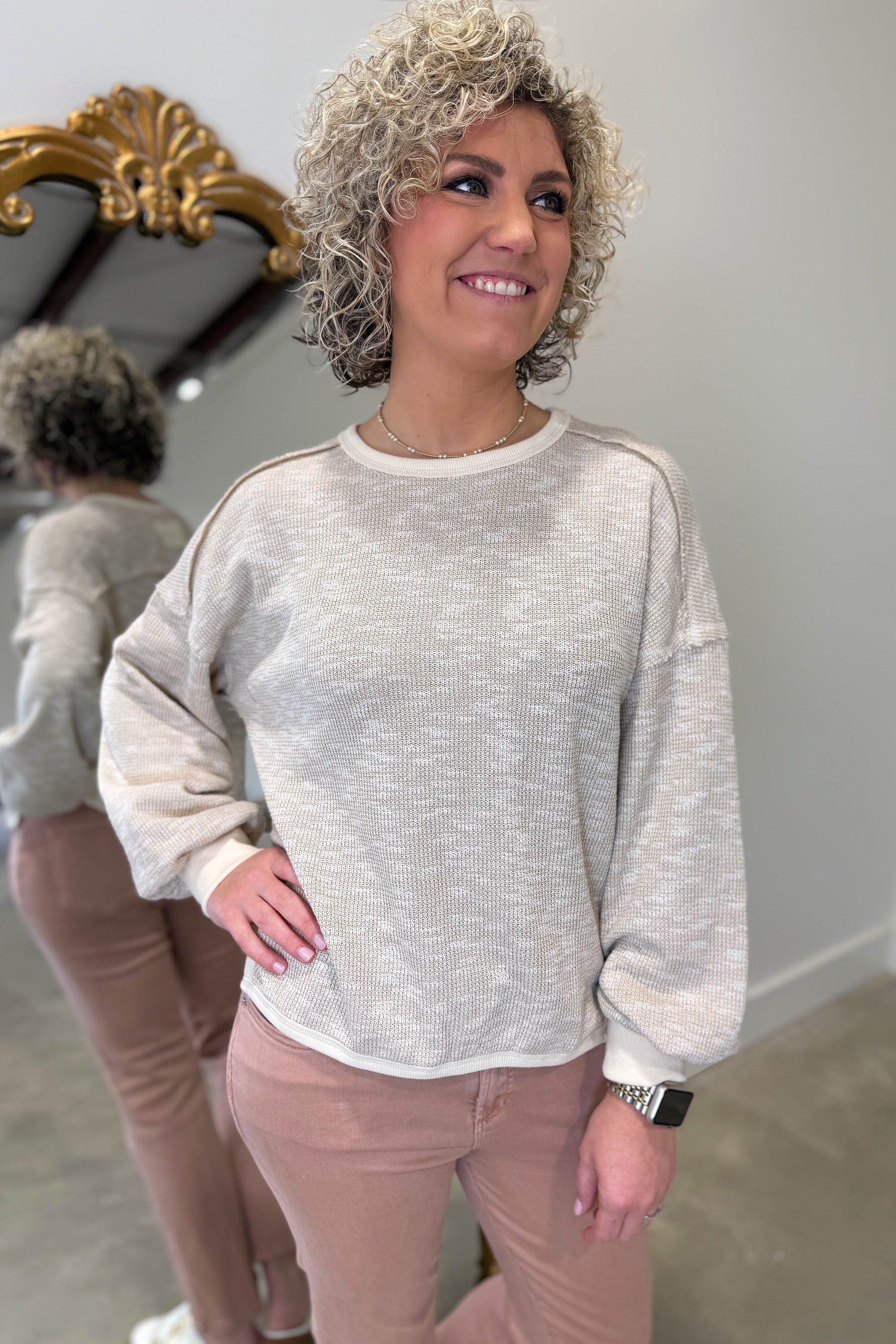 Comfy Days Long Sleeve Round Neck Top Beige