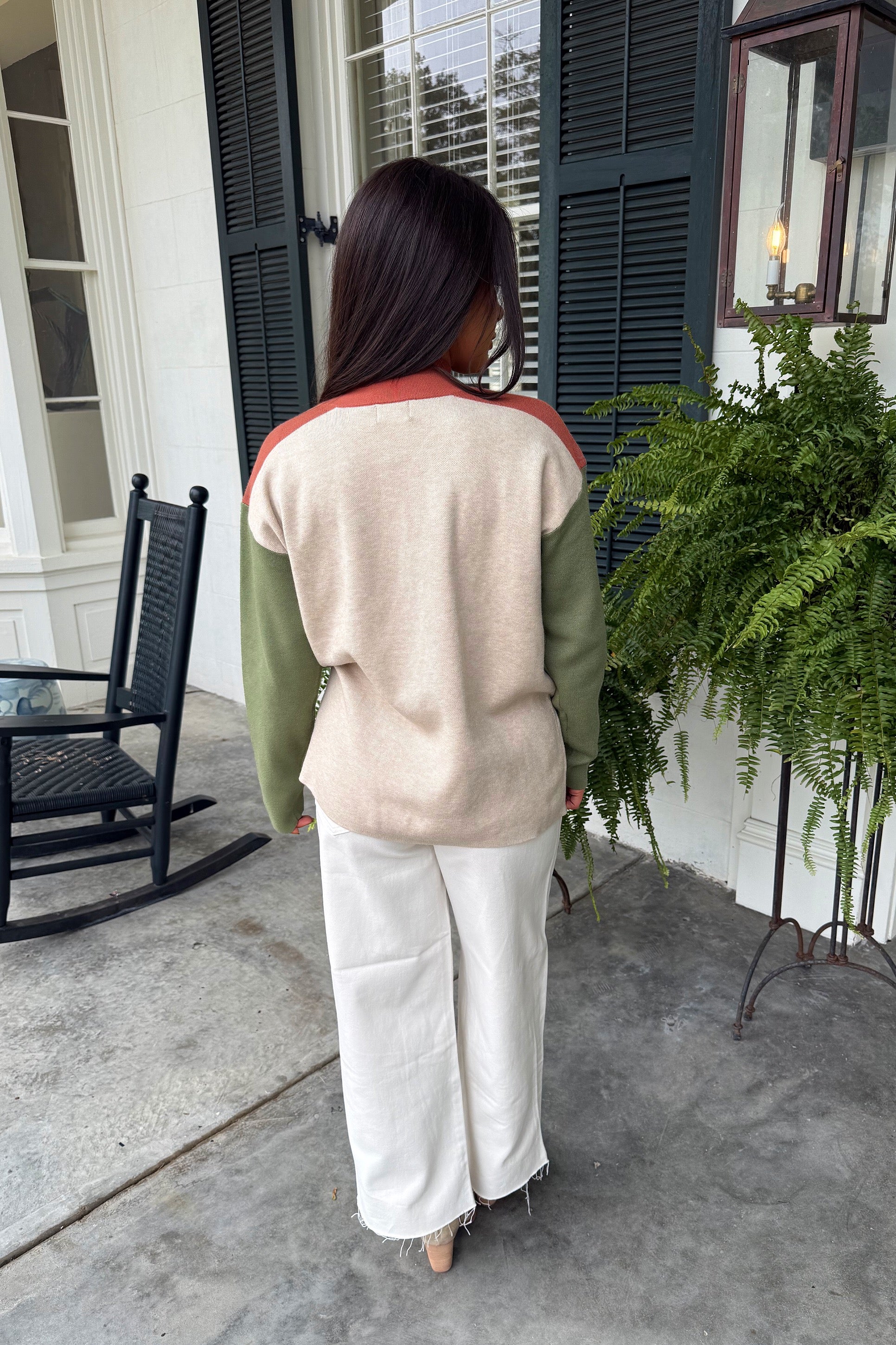 Craving Cozy Color Block Mock Neck Sweater Oatmeal Rust Olive