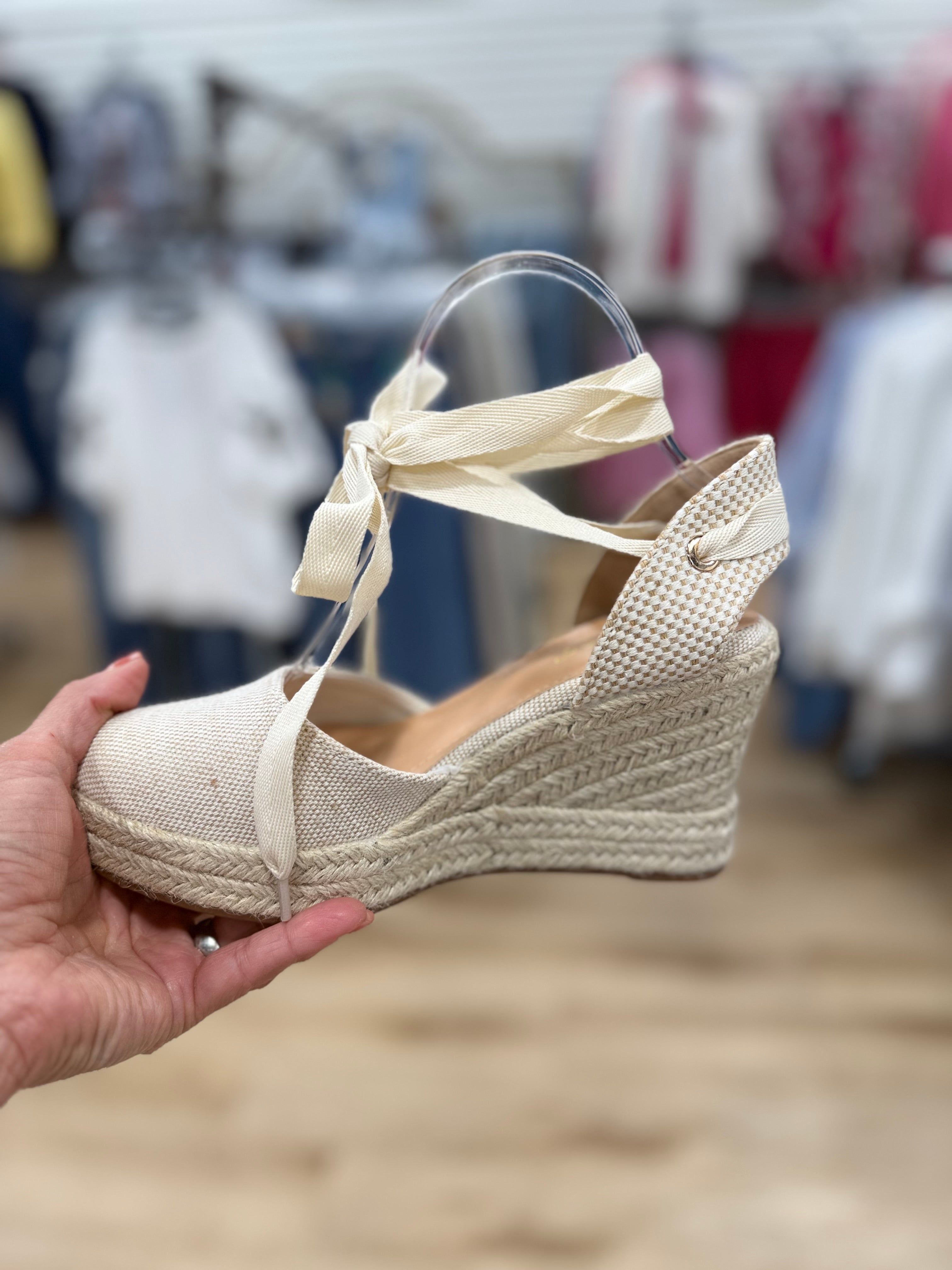 Ditch Espadrille Lace Up Closed Toe Wedge Beige Linen
