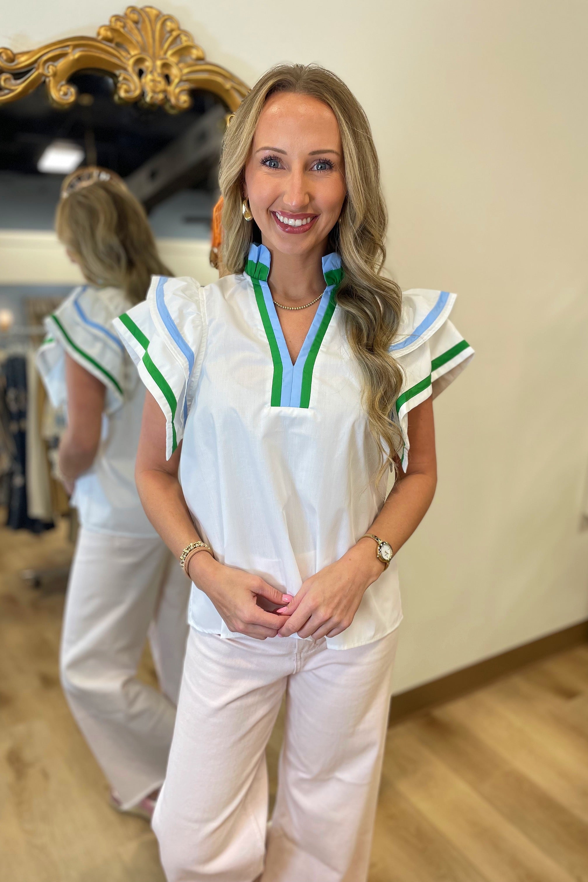 Dreamy Day Ruffle Sleeve Top w Blue/Green Trim White